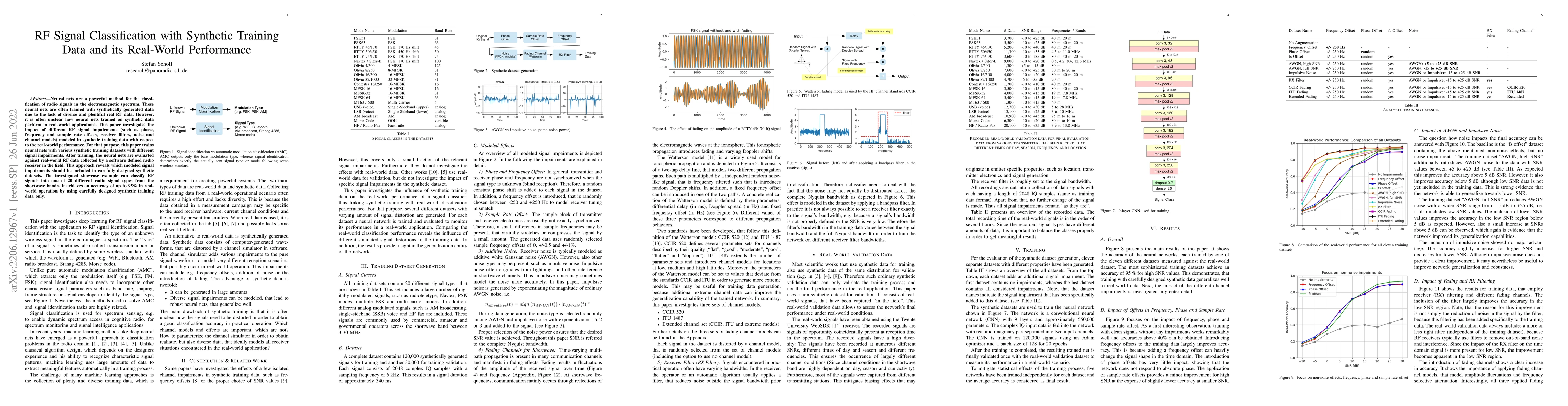 This paper explores the effectiveness of neural networks trained on synthetically generated data for RF signal classification, assessing how different signal impairments in synthetic training data impact real-world performance. The study finds that including specific modeled impairments in synthetic datasets can achieve up to 95% accuracy in classifying 20 different radio signal types in real-world scenarios.