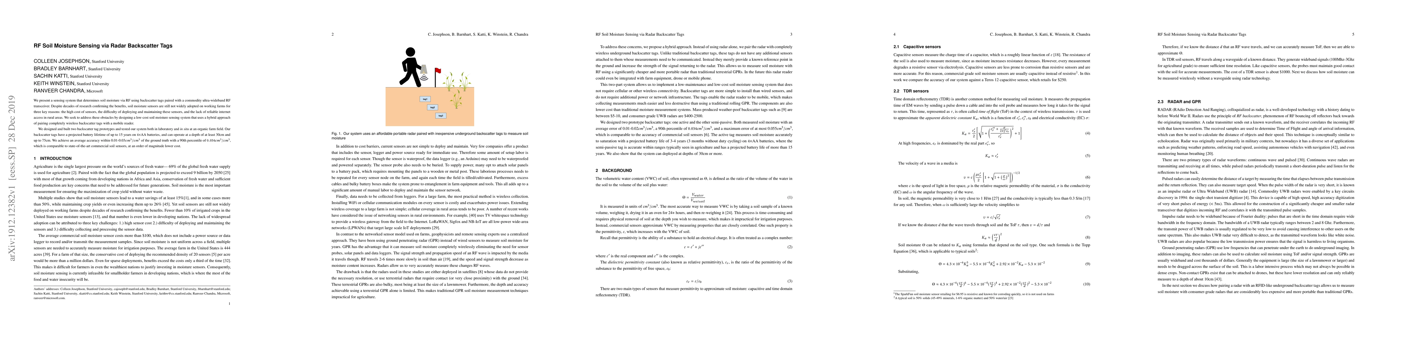 A low-cost soil moisture sensing system using wireless backscatter tags achieves accuracy comparable to commercial sensors at a fraction of the cost.
