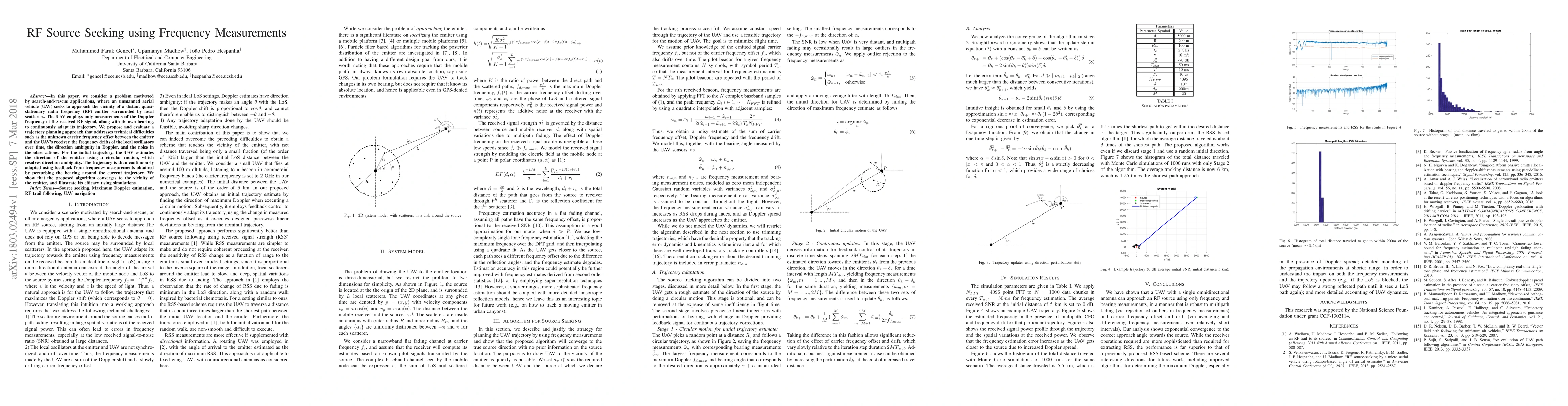 In this paper, we consider a problem motivated by search-and-rescue applications, where an unmanned aerial vehicle (UAV) seeks to approach the vicinity of a distant quasi-stationary radio frequency (RF) emitter surrounded by local scatterers. The UAV employs only measurements of the Doppler frequency of the received RF signal, along with its own bearing, to continuously adapt its trajectory. We propose and evaluate a trajectory planning approach that addresses technical difficulties such as the unknown carrier frequency offset between the emitter and the UAV's receiver, the frequency drifts of the local oscillators over time, the direction ambiguity in Doppler, and the noise in the observations. For the initial trajectory, the UAV estimates the direction of the emitter using a circular motion, which resolves direction ambiguity. The trajectory is then continuously adapted using feedback from frequency measurements obtained by perturbing the bearing around the current trajectory. We show that the proposed algorithm converges to the vicinity of the emitter, and illustrate its efficacy using simulations.