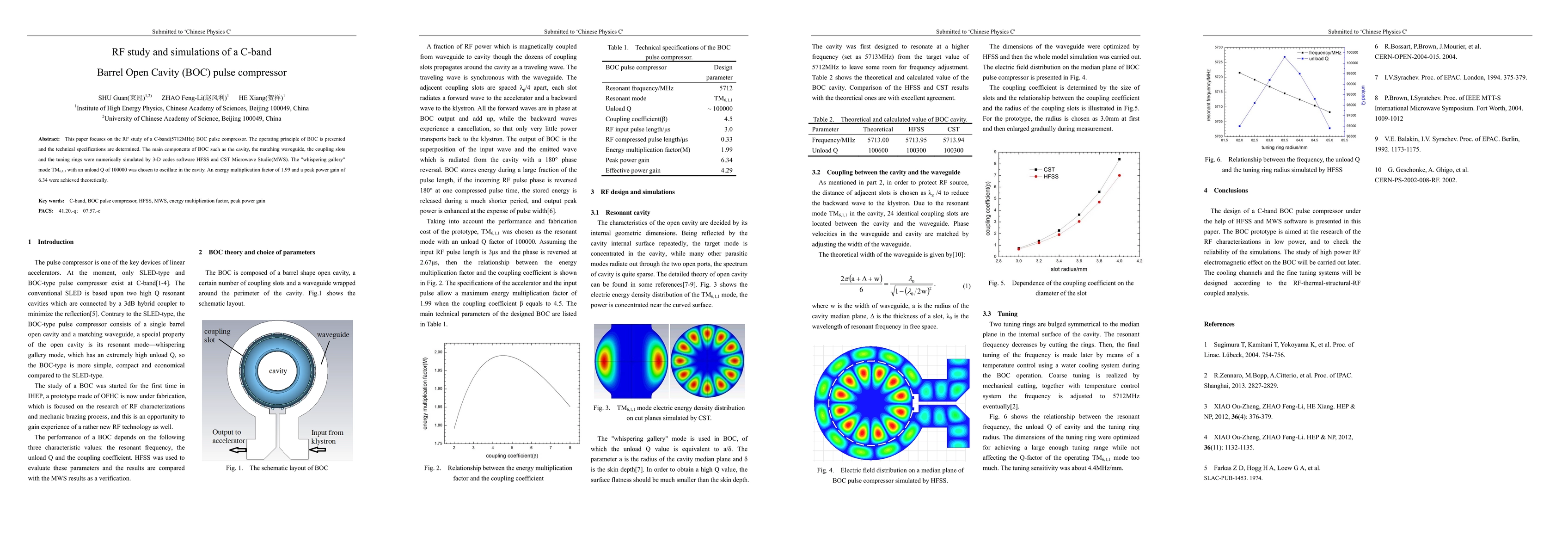 This paper focuses on the RF study of a C-band(5712MHz) BOC pulse compressor. The operating principle of BOC is presented and the technical specifications are determined. The main components of BOC such as the cavity, the matching waveguide, the coupling slots and the tuning rings were numerically simulated by 3-D codes software HFSS and CST Microwave Studio(MWS). The "whispering gallery" mode TM6,1,1 with an unload Q of 100000 was chosen to oscillate in the cavity. An energy multiplication factor of 1.99 and a peak power gain of 6.34 were achieved theoretically.