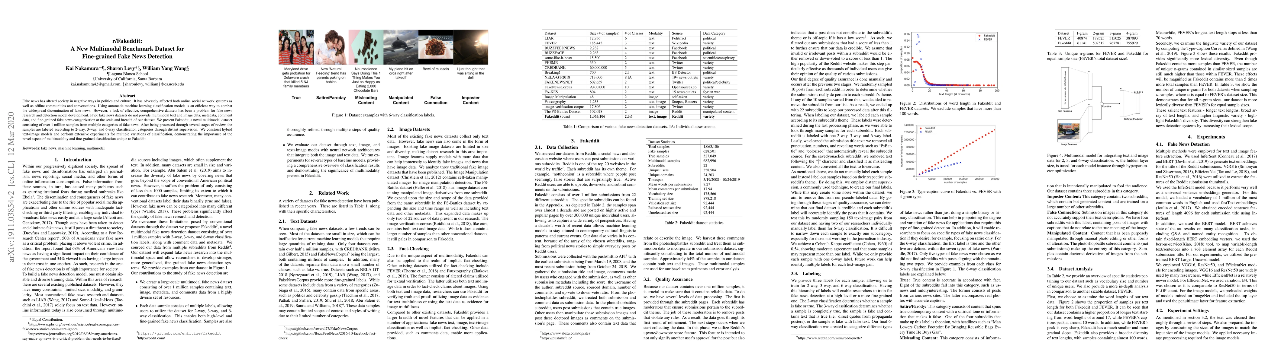 The paper introduces Fakeddit, a comprehensive multimodal benchmark dataset with over 1 million samples for fine-grained fake news detection, addressing the lack of multimodal data in existing datasets. The dataset enables advanced text+image models for improved fake news classification through extensive experiments.