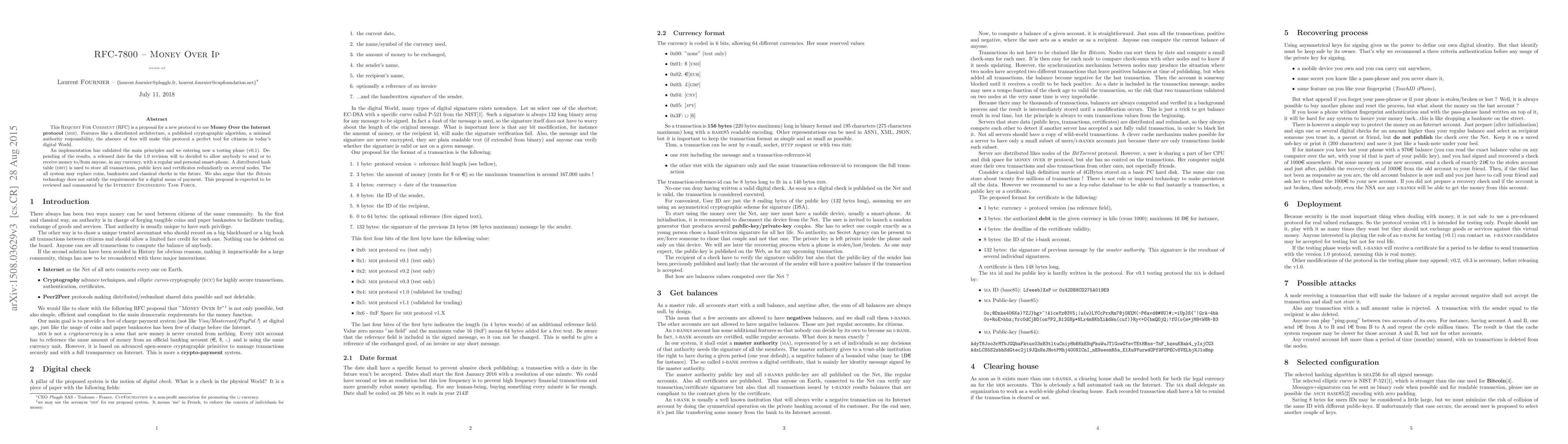 This Request For Comment (RFC) is a proposal for a new protocol to use money over the Internet. Features like a distributed architecture, a published cryptographic algorithm, a minimal authority responsibility, the absence of fees will make this protocol a perfect tool for citizens in today's digital World. An implementation has validated the main principles and we entering now a testing phase (v0.1). Depending of the results, a released date for the 1.0 revision will to decided to allow anybody to send or to receive money to/from anyone, in any currency, with a regular and personal smart-phone. A distributed hash table (DHT) is used to store all transactions, public keys and certificates redundantly on several nodes. The all system may replace coins, banknotes and classical checks in the future. We also argue that the Bitcoin technology does not satisfy the requirements for a digital mean of payment. This proposal is expected to be reviewed and commented by the Internet Engineering Task Force.