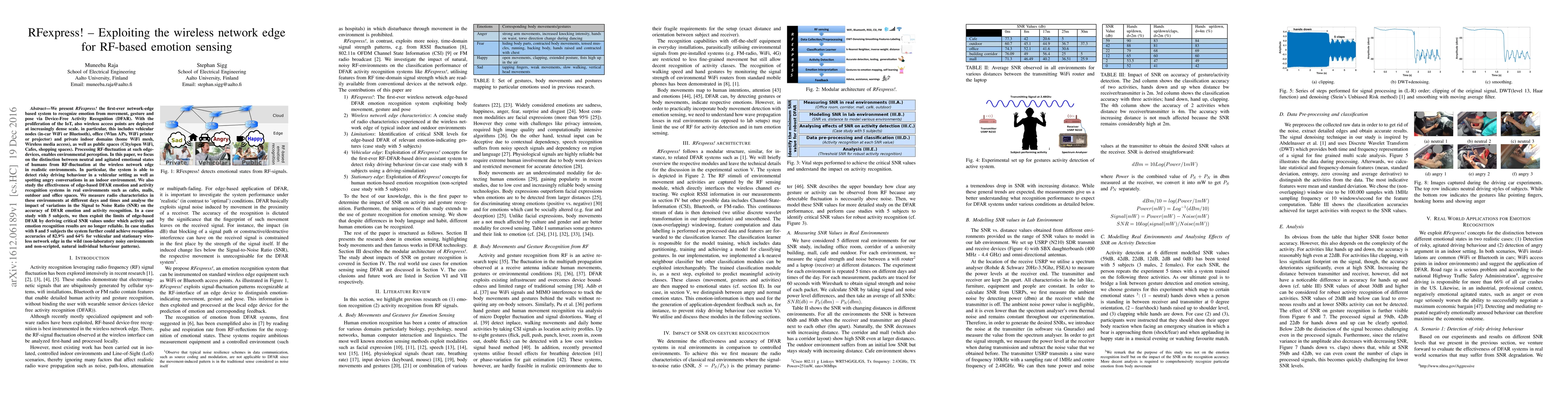 RFexpress! is a novel network-edge based system for emotion sensing using Device-Free Activity Recognition (DFAR) from RF fluctuations. It distinguishes neutral and agitated emotional states in various environments, achieving 82.9% accuracy in vehicular settings and 64% in stationary contexts, while analyzing the impact of Signal to Noise Ratio (SNR) on recognition accuracy.