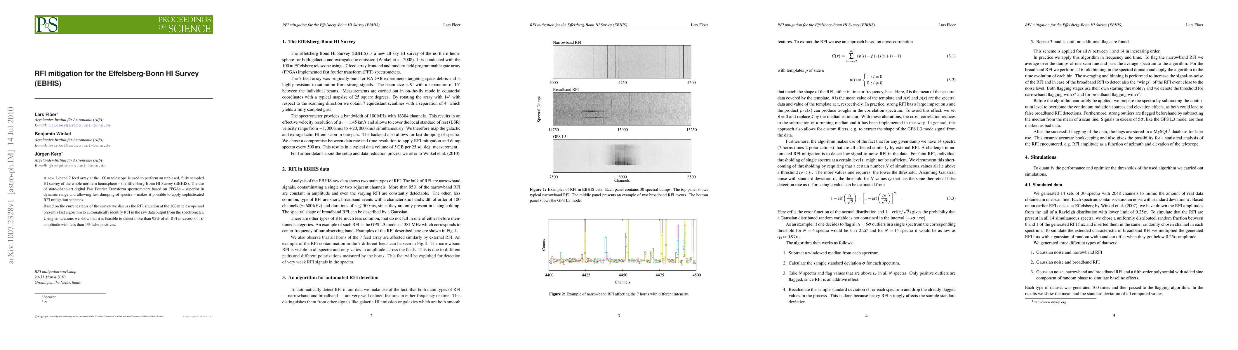 The Effelsberg-Bonn HI Survey (EBHIS) employs a new L-band feed array at the 100-m telescope for an unbiased HI survey. The paper presents a fast algorithm for automatic RFI identification in the survey's data, demonstrating the feasibility of detecting over 95% of RFI with minimal false positives.