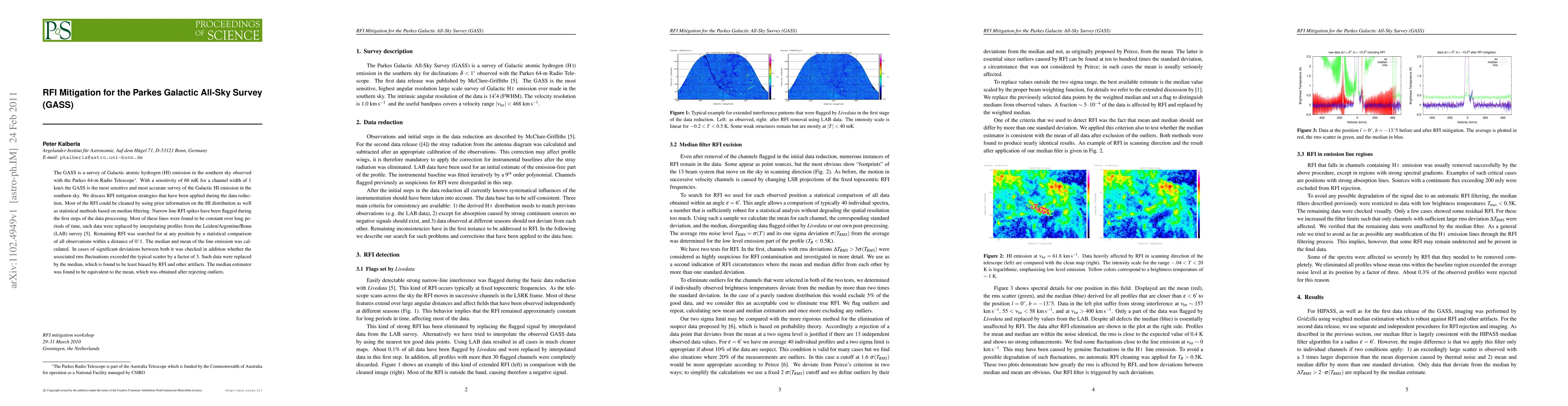 The research paper details RFI (Radio Frequency Interference) mitigation strategies for the Parkes Galactic All-Sky Survey (GASS). It employs methods such as median filtering, comparison with the LAB survey, and statistical outlier rejection to clean up RFI, ensuring high-accuracy HI emission data in the southern sky.