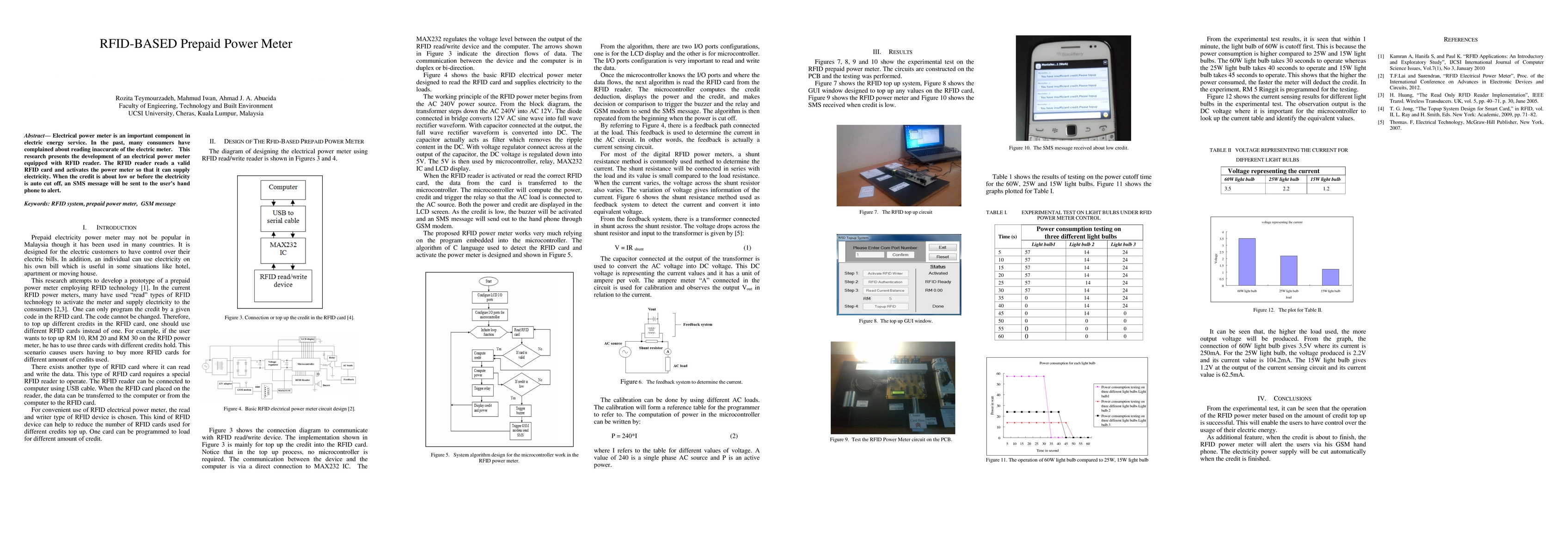 This paper introduces an RFID-based prepaid power meter that sends alerts to users when credit is low or electricity is about to be cut off. It aims to improve the accuracy of electric meters and provide a more convenient and secure payment system for electricity consumption.