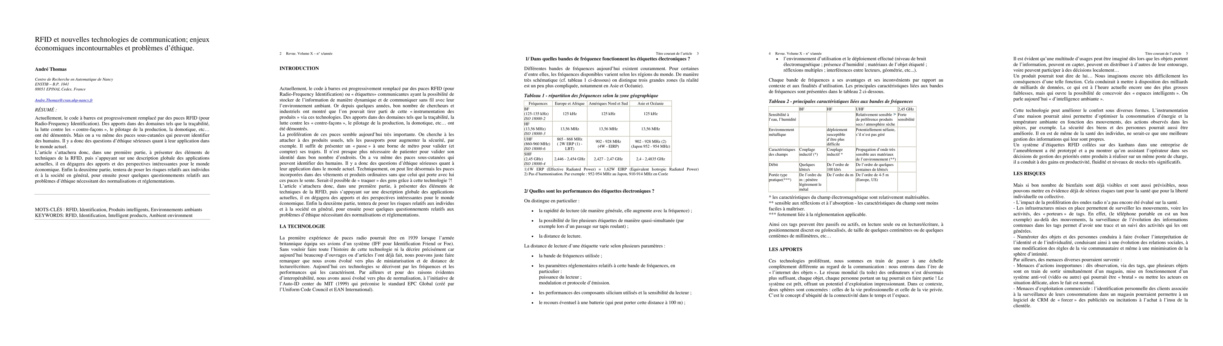 Auto ID technologies such RFID are more and more commonly used in industry and in distribution. Human are identify thanks to this technology, too. A lot of people have highlighted ethic problems relative to their utilization. This paper present first RFID technology, then it presents their opportunities in business and industry. In a second part, the paper highlights some ethic problems leading to a necessary standardization and regulation.