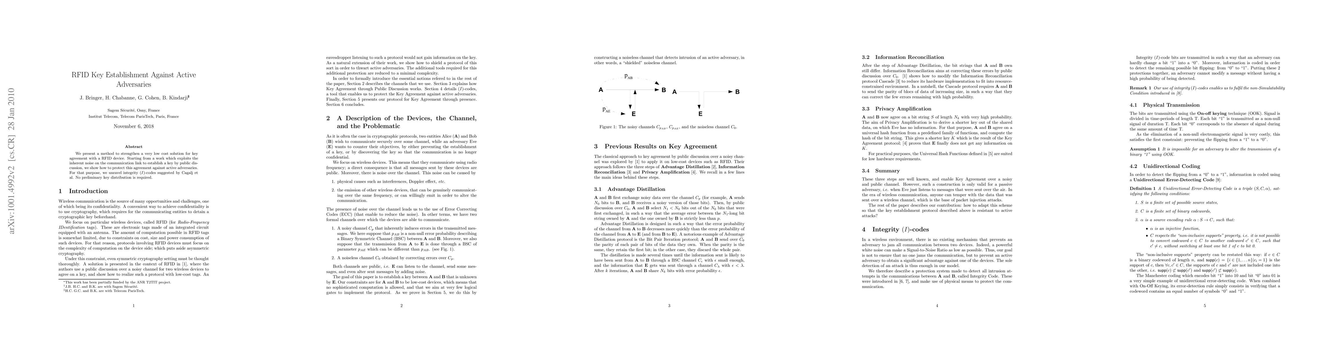 We present a method to strengthen a very low cost solution for key agreement with a RFID device. Starting from a work which exploits the inherent noise on the communication link to establish a key by public discussion, we show how to protect this agreement against active adversaries. For that purpose, we unravel integrity $(I)$-codes suggested by Cagalj et al. No preliminary key distribution is required.