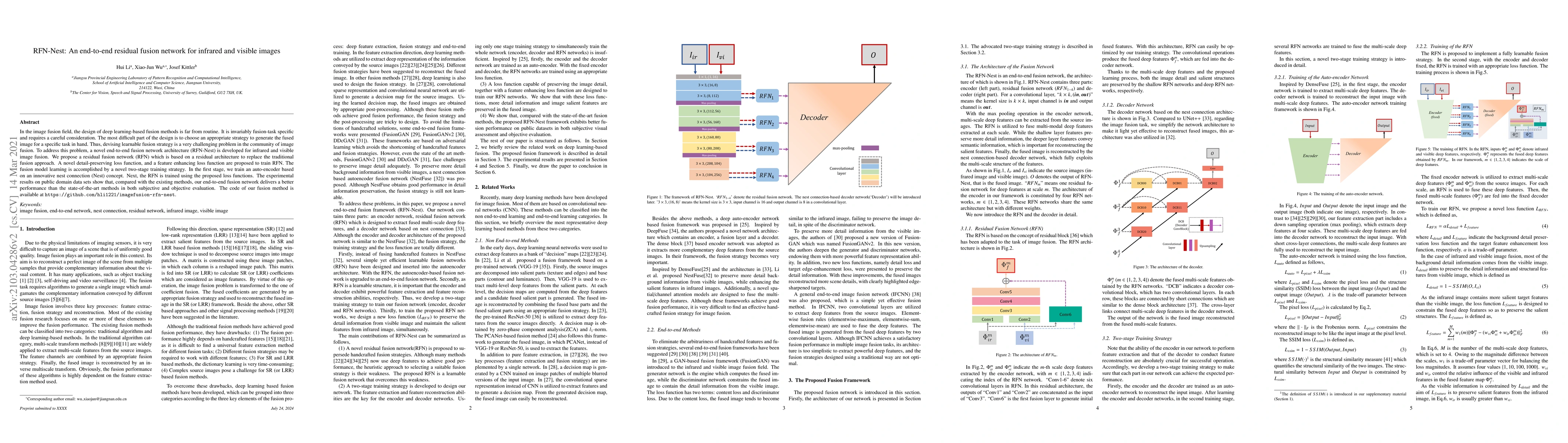 RFN-Nest is an innovative end-to-end residual fusion network designed for combining infrared and visible images, employing a novel residual fusion architecture and two-stage training strategy. The method outperforms existing techniques, achieving superior performance in both subjective and objective evaluations.