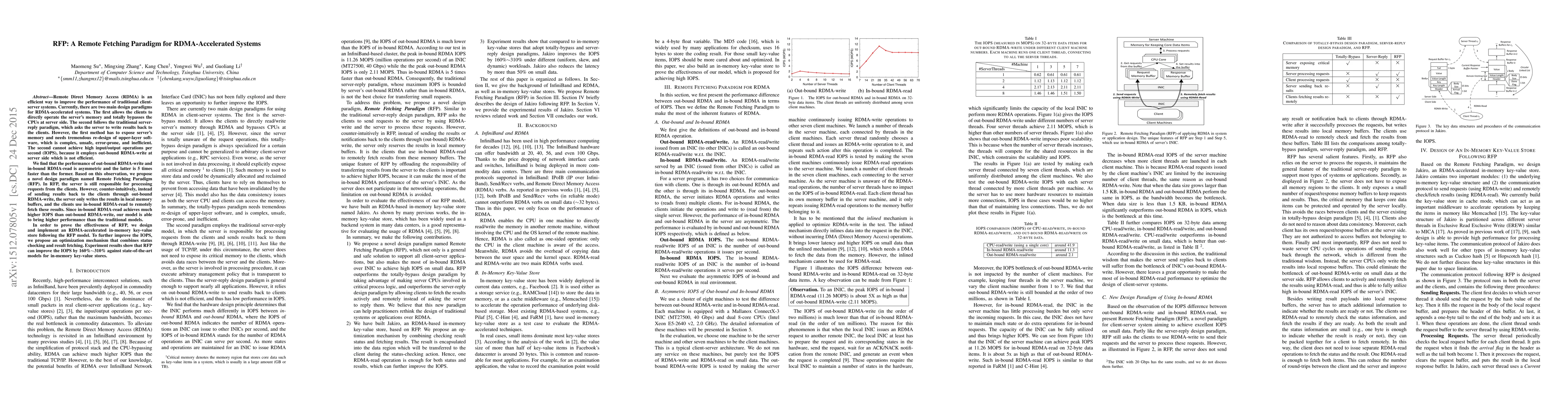This research is significant as it addresses the limitations of existing RDMA-accelerated systems by proposing a novel paradigm (RFP) that optimizes IOPS for small data, which is crucial for high-performance client-server systems, especially in-memory key-value stores.
