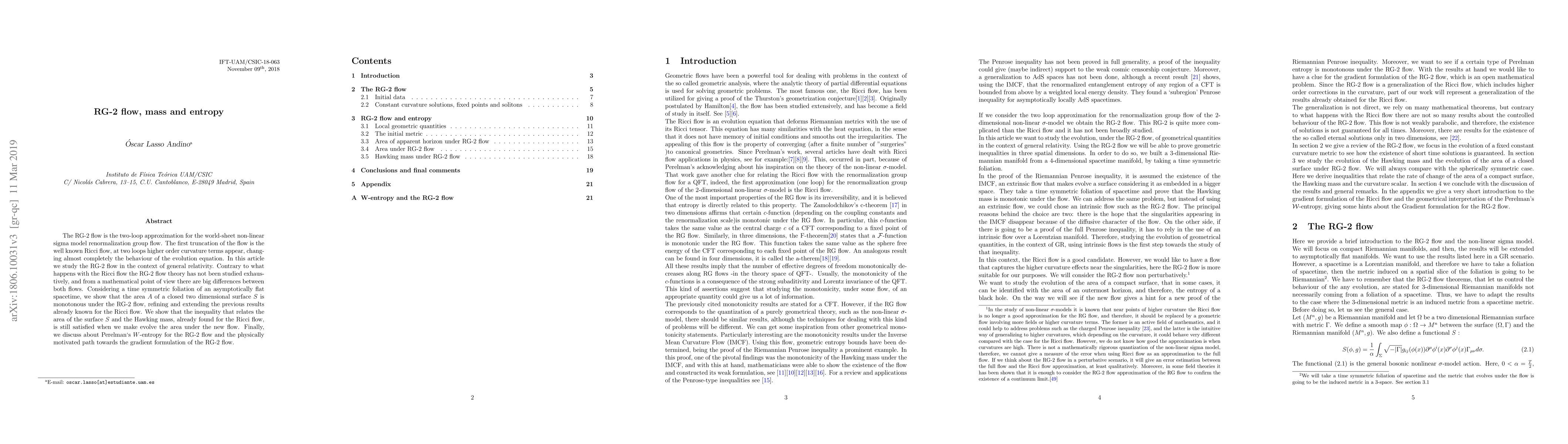 This paper explores the RG-2 flow, a two-loop approximation for the world-sheet non-linear sigma model, and compares its behavior to the Ricci flow in general relativity. It demonstrates that the area of closed surfaces evolves monotonically under the RG-2 flow, maintaining the area-mass inequality, and discusses the entropy implications in this context.