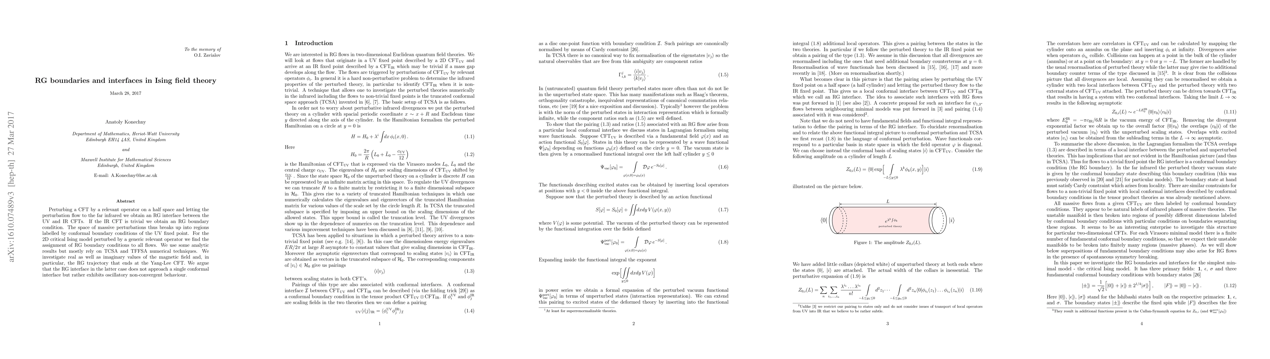 This research explores how relevant perturbations in a conformal field theory (CFT) lead to Renormalization Group (RG) interfaces or boundary conditions in the Ising field theory, employing both analytic and numerical techniques. It discovers distinct RG boundary behaviors, especially noting oscillatory non-convergence in the RG trajectory ending at the Yang-Lee critical fixed point.