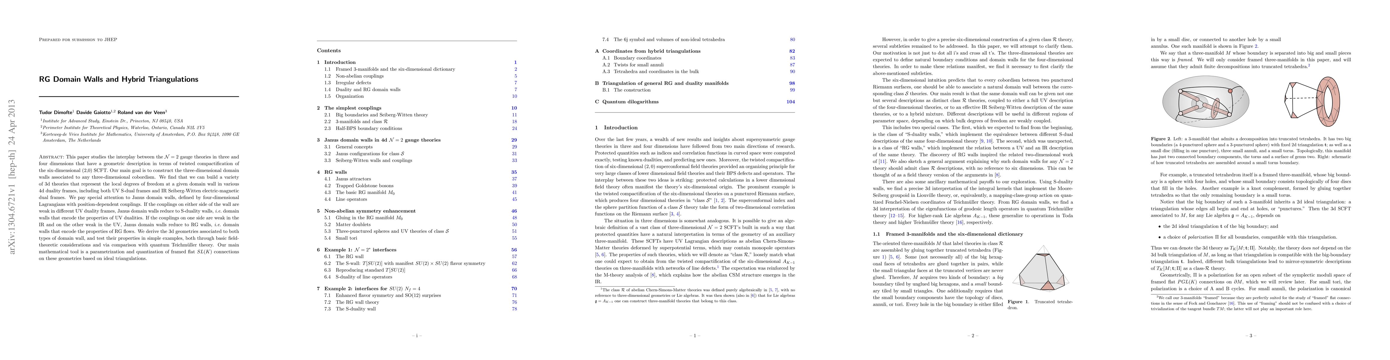 This paper studies the interplay between the N=2 gauge theories in three and four dimensions that have a geometric description in terms of twisted compactification of the six-dimensional (2,0) SCFT. Our main goal is to construct the three-dimensional domain walls associated to any three-dimensional cobordism. We find that we can build a variety of 3d theories that represent the local degrees of freedom at a given domain wall in various 4d duality frames, including both UV S-dual frames and IR Seiberg-Witten electric-magnetic dual frames. We pay special attention to Janus domain walls, defined by four-dimensional Lagrangians with position-dependent couplings. If the couplings on either side of the wall are weak in different UV duality frames, Janus domain walls reduce to S-duality walls, i.e. domain walls that encode the properties of UV dualities. If the couplings on one side are weak in the IR and on the other weak in the UV, Janus domain walls reduce to RG walls, i.e. domain walls that encode the properties of RG flows. We derive the 3d geometries associated to both types of domain wall, and test their properties in simple examples, both through basic field-theoretic considerations and via comparison with quantum Teichmuller theory. Our main mathematical tool is a parametrization and quantization of framed flat SL(K) connections on these geometries based on ideal triangulations.