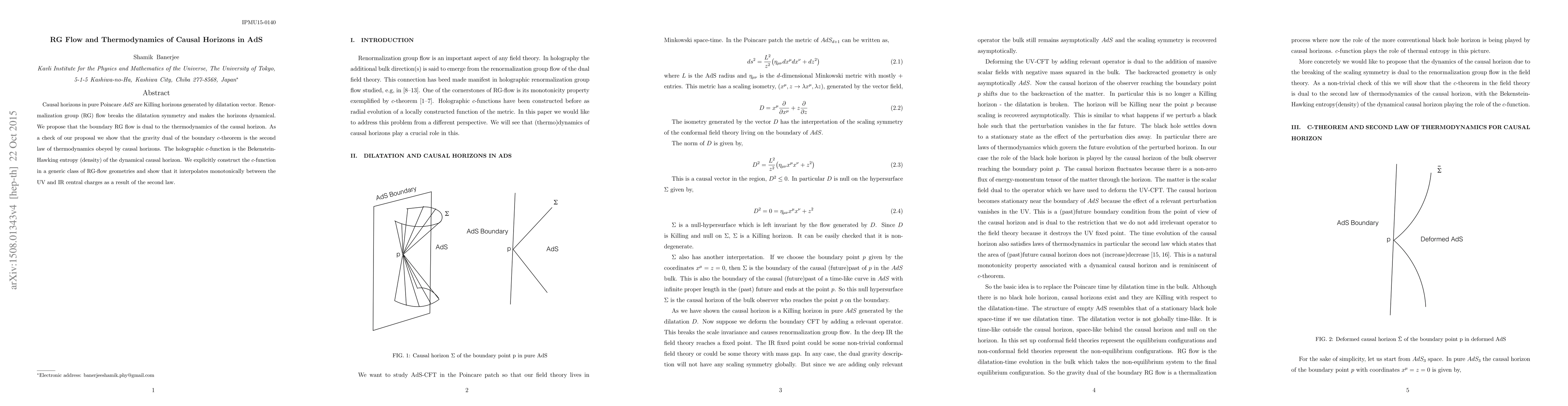 This paper investigates the thermodynamics of causal horizons in Poincaré AdS, proposing a dual relationship between renormalization group (RG) flow on the boundary and the thermodynamic properties of these horizons. It constructs the holographic $c$-function, demonstrating its monotonic interpolation between UV and IR central charges as a consequence of the second law of thermodynamics.