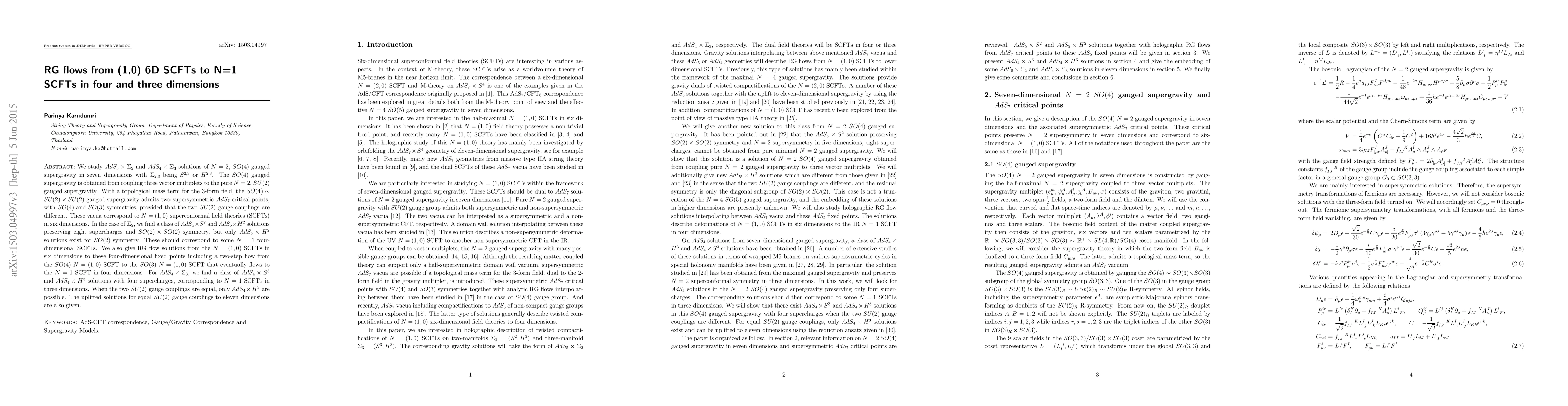 This paper investigates $AdS$ solutions in $N=2$, $SO(4)$ gauged supergravity, deriving RG flows from six-dimensional $N=(1,0)$ SCFTs to four-dimensional $N=1$ SCFTs and three-dimensional $N=1$ SCFTs. It finds specific flows, including a two-step flow from a six-dimensional $SO(4)$ $N=(1,0)$ SCFT to a four-dimensional $N=1$ SCFT.