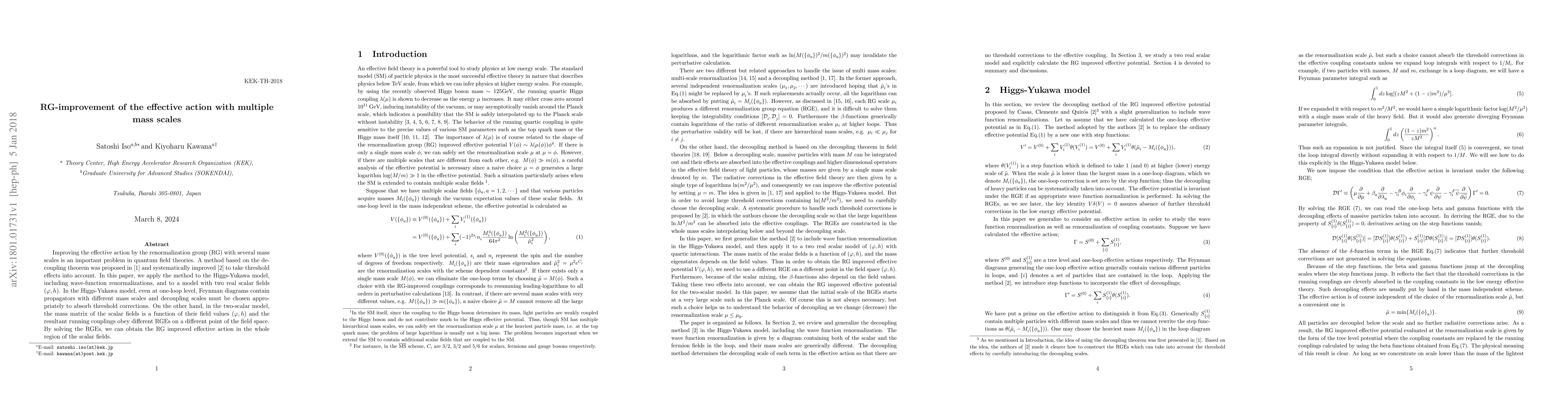 Improving the effective action by the renormalization group (RG) with several mass scales is an important problem in quantum field theories. A method based on the decoupling theorem was proposed in \cite{Bando:1992wy} and systematically improved \cite{Casas:1998cf} to take threshold effects into account. In this paper, we apply the method to the Higgs-Yukawa model, including wave-function renormalizations, and to a model with two real scalar fields $(\varphi, h)$. In the Higgs-Yukawa model, even at one-loop level, Feynman diagrams contain propagators with different mass scales and decoupling scales must be chosen appropriately to absorb threshold corrections. On the other hand, in the two-scalar model, the mass matrix of the scalar fields is a function of their field values $(\varphi, h)$ and the resultant running couplings obey different RGEs on a different point of the field space. By solving the RGEs, we can obtain the RG improved effective action in the whole region of the scalar fields.
