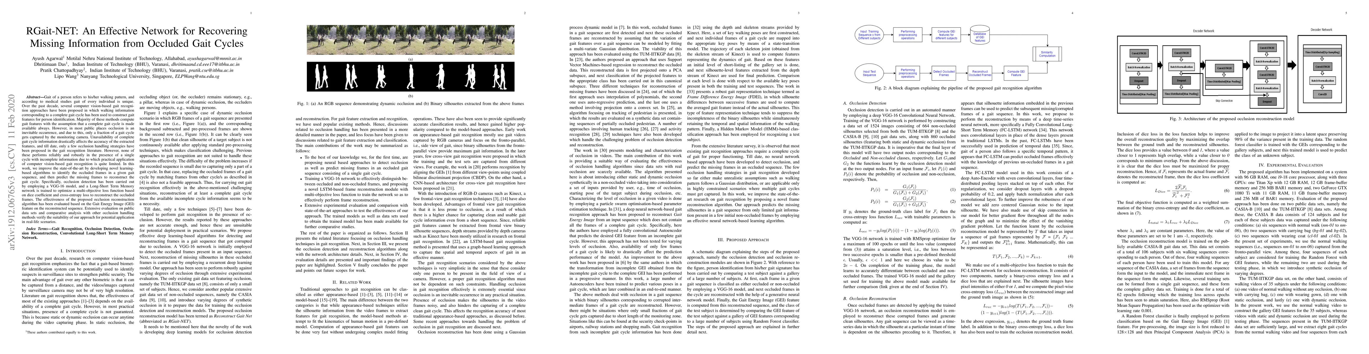 Gait of a person refers to his/her walking pattern, and according to medical studies gait of every individual is unique. Over the past decade, several computer vision-based gait recognition approaches have been proposed in which walking information corresponding to a complete gait cycle has been used to construct gait features for person identification. These methods compute gait features with the inherent assumption that a complete gait cycle is always available. However, in most public places occlusion is an inevitable occurrence, and due to this, only a fraction of a gait cycle gets captured by the monitoring camera. Unavailability of complete gait cycle information drastically affects the accuracy of the extracted features, and till date, only a few occlusion handling strategies to gait recognition have been proposed. But none of these performs reliably and robustly in the presence of a single cycle with incomplete information, and because of this practical application of gait recognition is quite limited. In this work, we develop deep learning-based algorithm to accurately identify the affected frames as well as predict the missing frames to reconstruct a complete gait cycle. While occlusion detection has been carried out by employing a VGG-16 model, the model for frame reconstruction is based on Long-Short Term Memory network that has been trained to optimize a multi-objective function based on dice coefficient and cross-entropy loss. The effectiveness of the proposed occlusion reconstruction algorithm is evaluated by computing the accuracy of the popular Gait Energy Feature on the reconstructed sequence. Experimental evaluation on public data sets and comparative analysis with other occlusion handling methods verify the effectiveness of our approach.