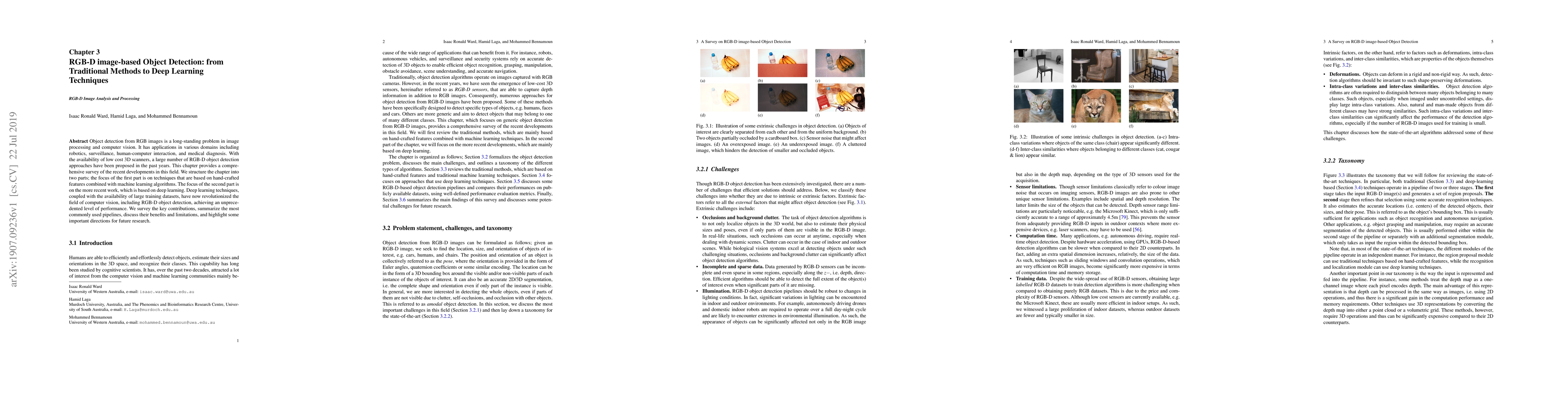 Object detection from RGB images is a long-standing problem in image processing and computer vision. It has applications in various domains including robotics, surveillance, human-computer interaction, and medical diagnosis. With the availability of low cost 3D scanners, a large number of RGB-D object detection approaches have been proposed in the past years. This chapter provides a comprehensive survey of the recent developments in this field. We structure the chapter into two parts; the focus of the first part is on techniques that are based on hand-crafted features combined with machine learning algorithms. The focus of the second part is on the more recent work, which is based on deep learning. Deep learning techniques, coupled with the availability of large training datasets, have now revolutionized the field of computer vision, including RGB-D object detection, achieving an unprecedented level of performance. We survey the key contributions, summarize the most commonly used pipelines, discuss their benefits and limitations, and highlight some important directions for future research.
