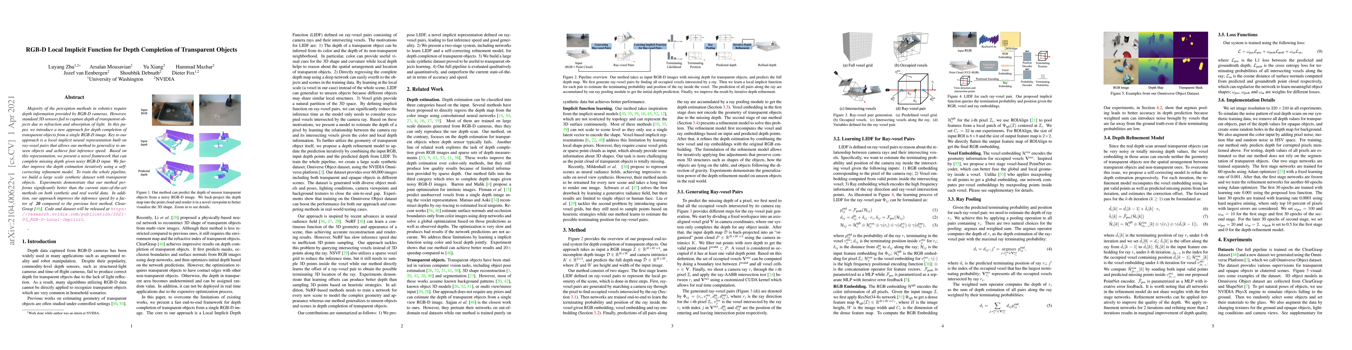 Majority of the perception methods in robotics require depth information provided by RGB-D cameras. However, standard 3D sensors fail to capture depth of transparent objects due to refraction and absorption of light. In this paper, we introduce a new approach for depth completion of transparent objects from a single RGB-D image. Key to our approach is a local implicit neural representation built on ray-voxel pairs that allows our method to generalize to unseen objects and achieve fast inference speed. Based on this representation, we present a novel framework that can complete missing depth given noisy RGB-D input. We further improve the depth estimation iteratively using a self-correcting refinement model. To train the whole pipeline, we build a large scale synthetic dataset with transparent objects. Experiments demonstrate that our method performs significantly better than the current state-of-the-art methods on both synthetic and real world data. In addition, our approach improves the inference speed by a factor of 20 compared to the previous best method, ClearGrasp. Code and dataset will be released at https://research.nvidia.com/publication/2021-03_RGB-D-Local-Implicit.