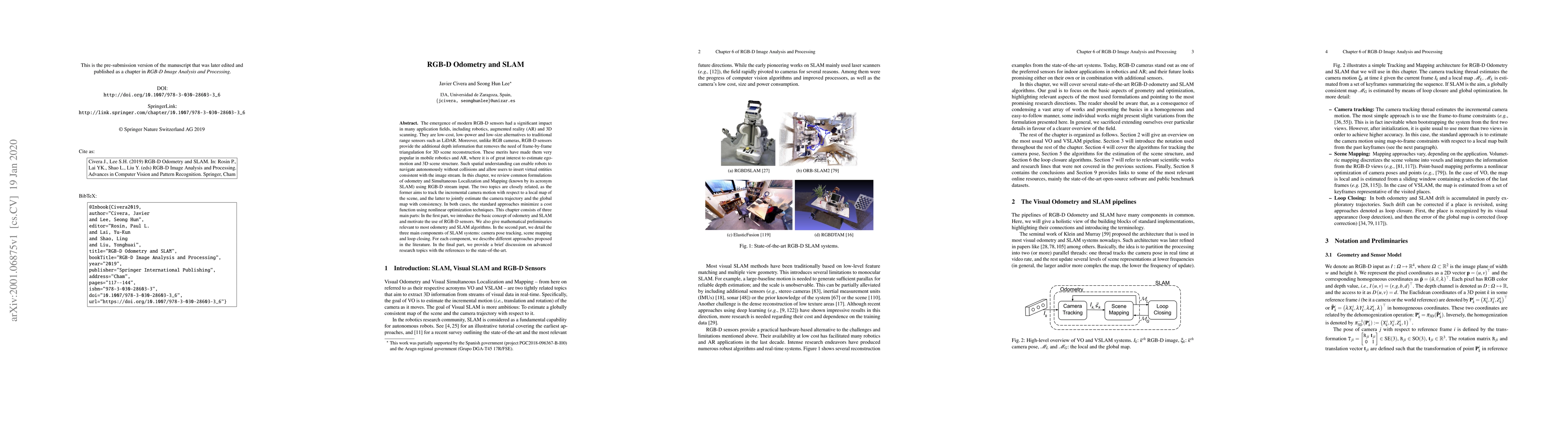 This paper reviews the use of RGB-D sensors for odometry and SLAM in robotics and augmented reality, emphasizing their advantages over traditional sensors. It discusses the mathematical foundations, key components of SLAM systems, and advanced research topics.
