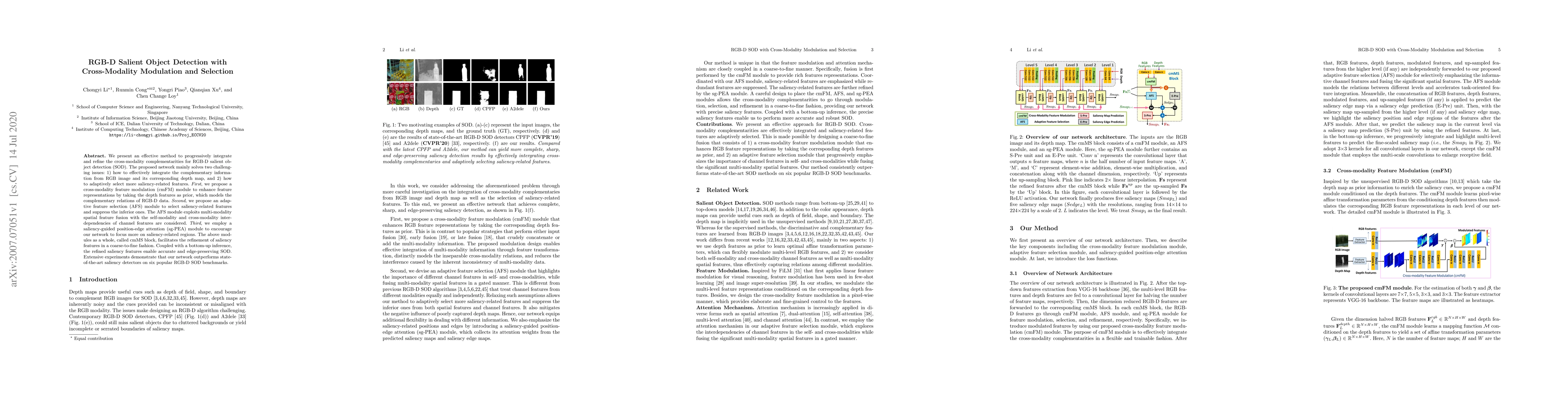 This paper proposes an RGB-D salient object detection method using cross-modality modulation and selection. It integrates complementary information from RGB images and depth maps through a cross-modality feature modulation module and adaptively selects salient features with an adaptive feature selection module, achieving accurate and edge-preserving detection.