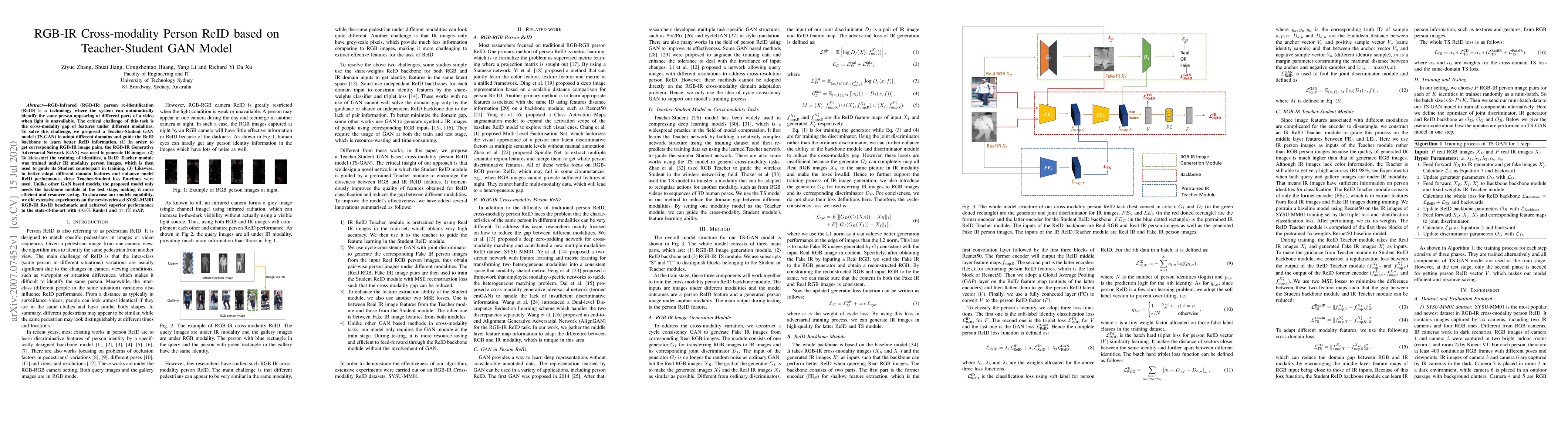 RGB-Infrared (RGB-IR) person re-identification (ReID) is a technology where the system can automatically identify the same person appearing at different parts of a video when light is unavailable. The critical challenge of this task is the cross-modality gap of features under different modalities. To solve this challenge, we proposed a Teacher-Student GAN model (TS-GAN) to adopt different domains and guide the ReID backbone to learn better ReID information. (1) In order to get corresponding RGB-IR image pairs, the RGB-IR Generative Adversarial Network (GAN) was used to generate IR images. (2) To kick-start the training of identities, a ReID Teacher module was trained under IR modality person images, which is then used to guide its Student counterpart in training. (3) Likewise, to better adapt different domain features and enhance model ReID performance, three Teacher-Student loss functions were used. Unlike other GAN based models, the proposed model only needs the backbone module at the test stage, making it more efficient and resource-saving. To showcase our model's capability, we did extensive experiments on the newly-released SYSU-MM01 RGB-IR Re-ID benchmark and achieved superior performance to the state-of-the-art with 49.8% Rank-1 and 47.4% mAP.