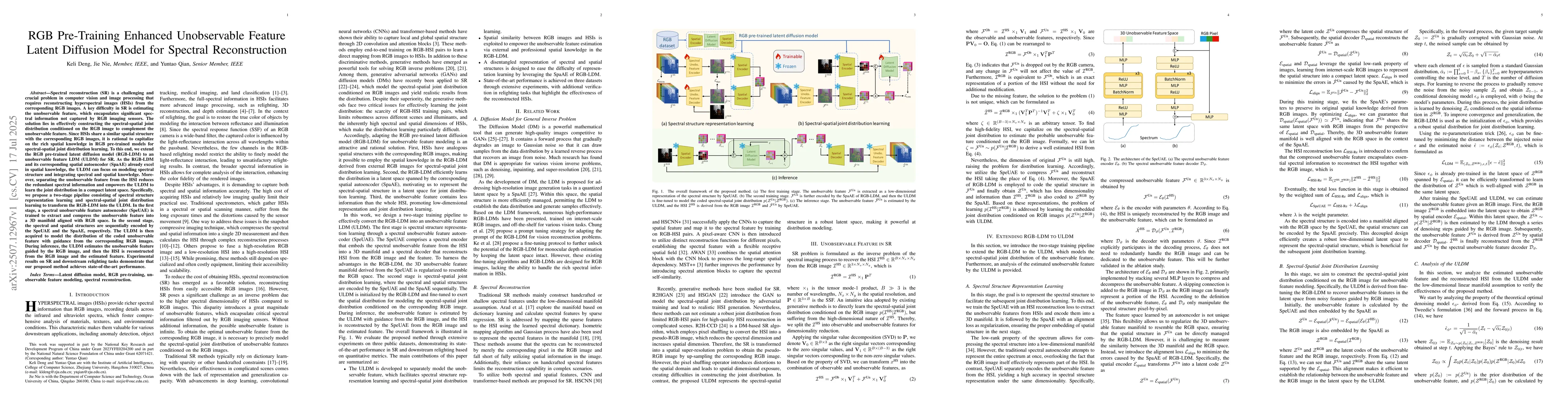 Spectral reconstruction (SR) is a crucial problem in image processing that requires reconstructing hyperspectral images (HSIs) from the corresponding RGB images. A key difficulty in SR is estimating the unobservable feature, which encapsulates significant spectral information not captured by RGB imaging sensors. The solution lies in effectively constructing the spectral-spatial joint distribution conditioned on the RGB image to complement the unobservable feature. Since HSIs share a similar spatial structure with the corresponding RGB images, it is rational to capitalize on the rich spatial knowledge in RGB pre-trained models for spectral-spatial joint distribution learning. To this end, we extend the RGB pre-trained latent diffusion model (RGB-LDM) to an unobservable feature LDM (ULDM) for SR. As the RGB-LDM and its corresponding spatial autoencoder (SpaAE) already excel in spatial knowledge, the ULDM can focus on modeling spectral structure. Moreover, separating the unobservable feature from the HSI reduces the redundant spectral information and empowers the ULDM to learn the joint distribution in a compact latent space. Specifically, we propose a two-stage pipeline consisting of spectral structure representation learning and spectral-spatial joint distribution learning to transform the RGB-LDM into the ULDM. In the first stage, a spectral unobservable feature autoencoder (SpeUAE) is trained to extract and compress the unobservable feature into a 3D manifold aligned with RGB space. In the second stage, the spectral and spatial structures are sequentially encoded by the SpeUAE and the SpaAE, respectively. The ULDM is then acquired to model the distribution of the coded unobservable feature with guidance from the corresponding RGB images. Experimental results on SR and downstream relighting tasks demonstrate that our proposed method achieves state-of-the-art performance.