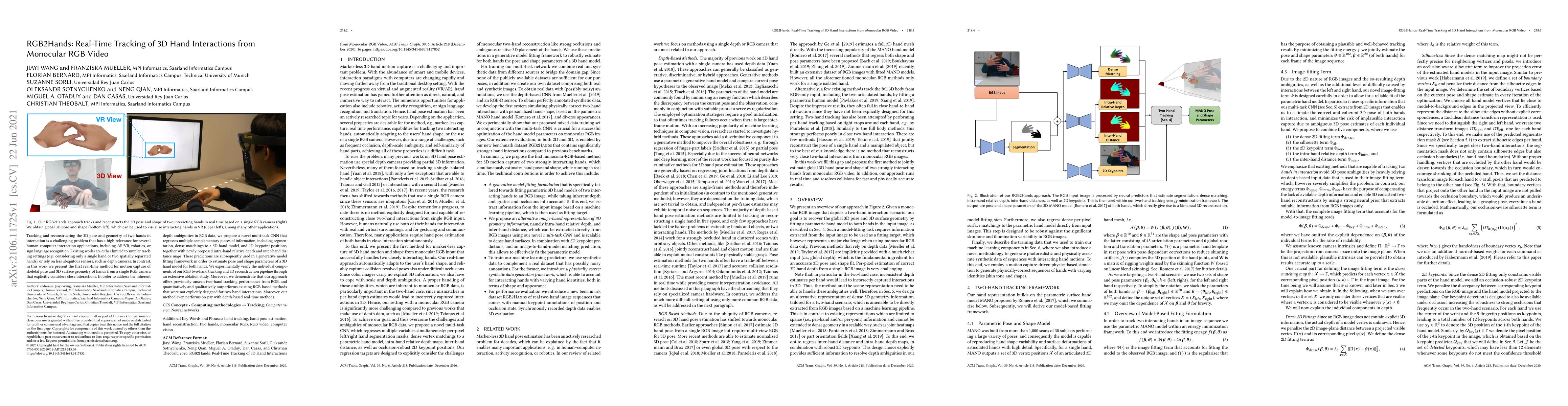 RGB2Hands presents a real-time 3D hand tracking method from a single RGB camera, addressing close hand interactions. It uses a novel multi-task CNN to predict segmentation, 2D keypoints, and depth maps, which are then used in a generative model to estimate 3D hand pose and geometry, outperforming existing RGB-based methods.
