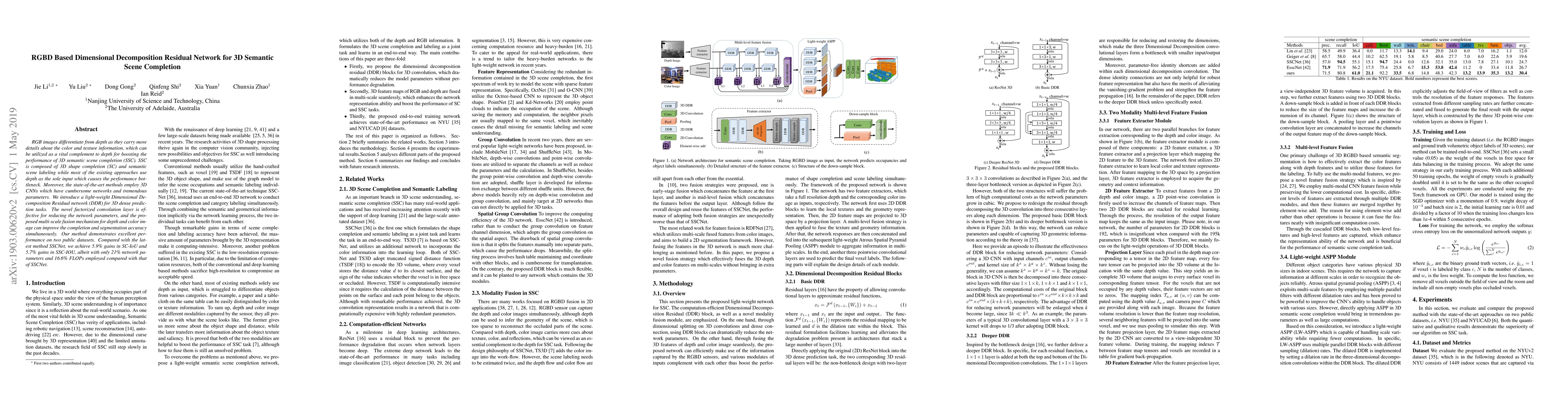 This paper introduces a lightweight Dimensional Decomposition Residual Network (DDR) for 3D semantic scene completion, leveraging both RGB and depth images to enhance performance. The DDR network, with its factorized convolution and multi-scale fusion mechanism, significantly reduces parameters and computational costs while achieving superior accuracy over existing methods.