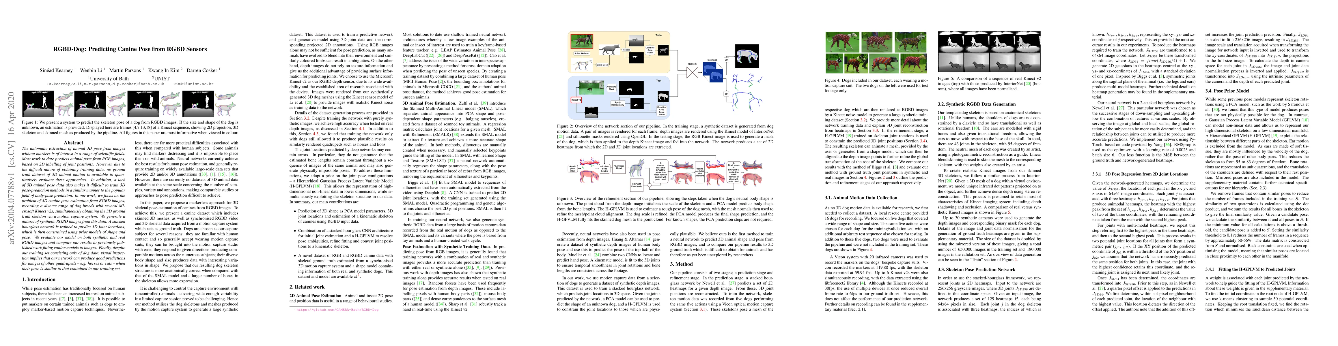 This paper presents RGBD-Dog, a method for predicting 3D canine pose from RGBD images using a stacked hourglass network trained on a dataset of synthetic and real RGBD images. The authors demonstrate the model's effectiveness and its potential generalization to other quadrupeds with similar poses.