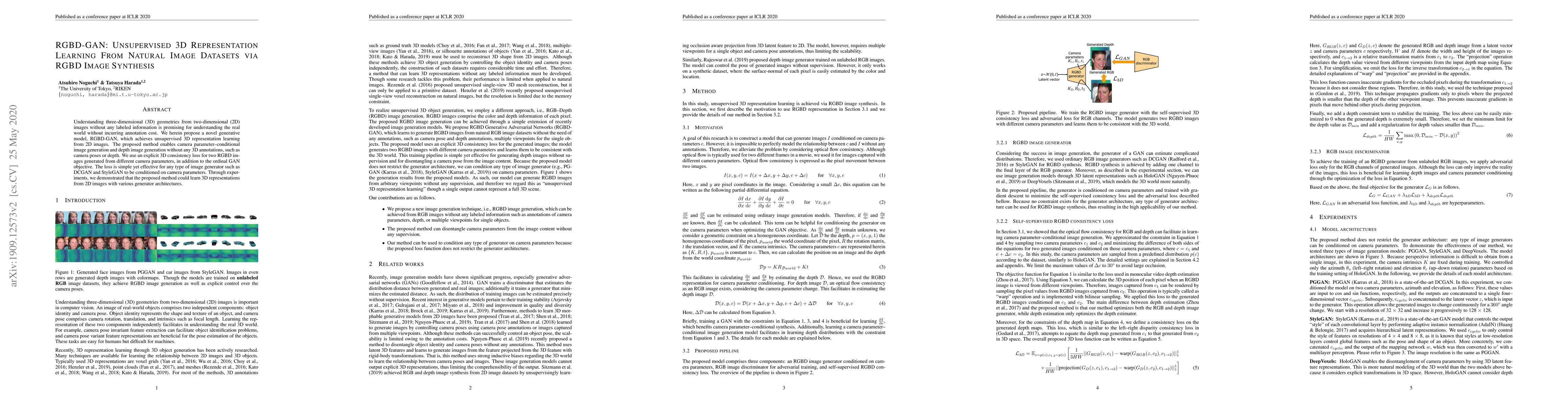 The paper proposes RGBD-GAN, a novel generative model for unsupervised 3D representation learning from 2D images, enabling camera parameter-conditional image and depth generation without 3D annotations. It employs an explicit 3D consistency loss alongside GAN objectives to achieve effective 3D representation learning.