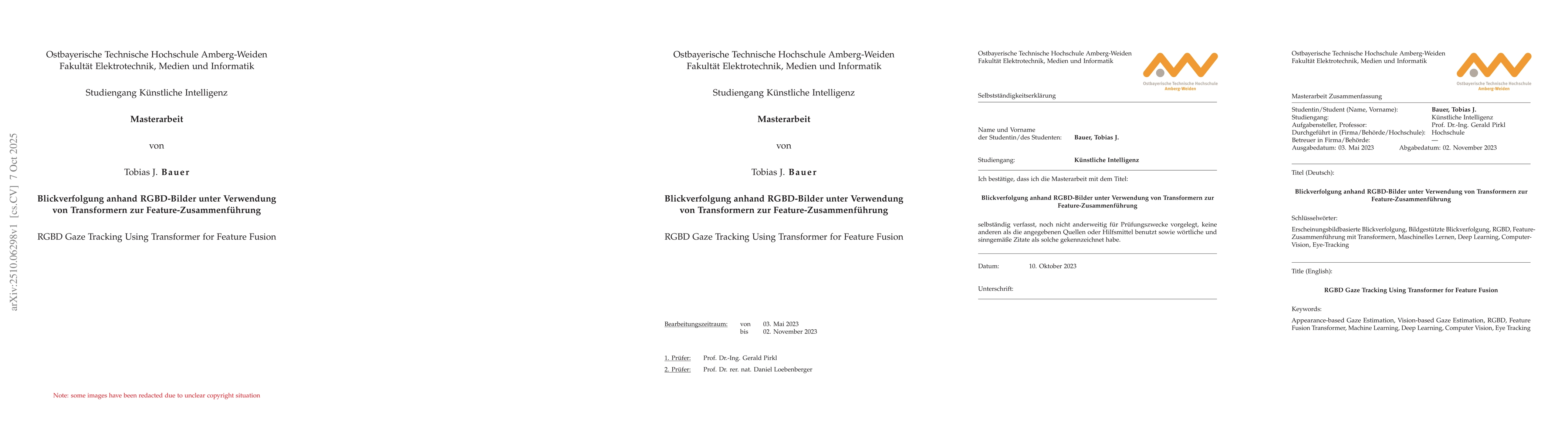 Subject of this thesis is the implementation of an AI-based Gaze Tracking system using RGBD images that contain both color (RGB) and depth (D) information. To fuse the features extracted from the images, a module based on the Transformer architecture is used. The combination of RGBD input images and Transformers was chosen because it has not yet been investigated. Furthermore, a new dataset is created for training the AI models as existing datasets either do not contain depth information or only contain labels for Gaze Point Estimation that are not suitable for the task of Gaze Angle Estimation. Various model configurations are trained, validated and evaluated on a total of three different datasets. The trained models are then to be used in a real-time pipeline to estimate the gaze direction and thus the gaze point of a person in front of a computer screen. The AI model architecture used in this thesis is based on an earlier work by Lian et al. It uses a Generative Adversarial Network (GAN) to simultaneously remove depth map artifacts and extract head pose features. Lian et al. achieve a mean Euclidean error of 38.7mm on their own dataset ShanghaiTechGaze+. In this thesis, a model architecture with a Transformer module for feature fusion achieves a mean Euclidean error of 55.3mm on the same dataset, but we show that using no pre-trained GAN module leads to a mean Euclidean error of 30.1mm. Replacing the Transformer module with a Multilayer Perceptron (MLP) improves the error to 26.9mm. These results are coherent with the ones on the other two datasets. On the ETH-XGaze dataset, the model with Transformer module achieves a mean angular error of 3.59{\deg} and without Transformer module 3.26{\deg}, whereas the fundamentally different model architecture used by the dataset authors Zhang et al. achieves a mean angular error of 2.04{\deg}. On the OTH-Gaze-Estimation dataset created for...
