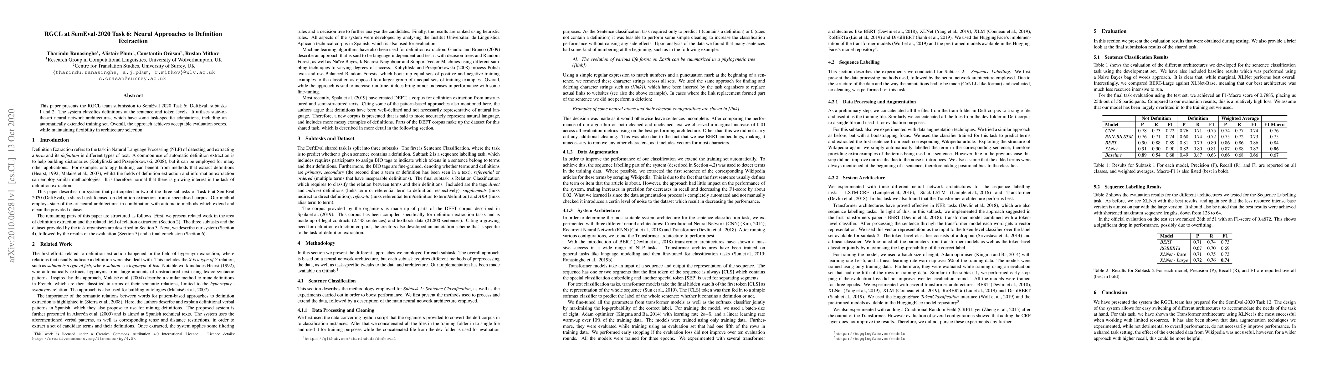 This paper details the RGCL team's submission to SemEval 2020 Task 6, DeftEval, employing neural networks for sentence and token-level definition classification, achieving acceptable scores with adaptable architecture.