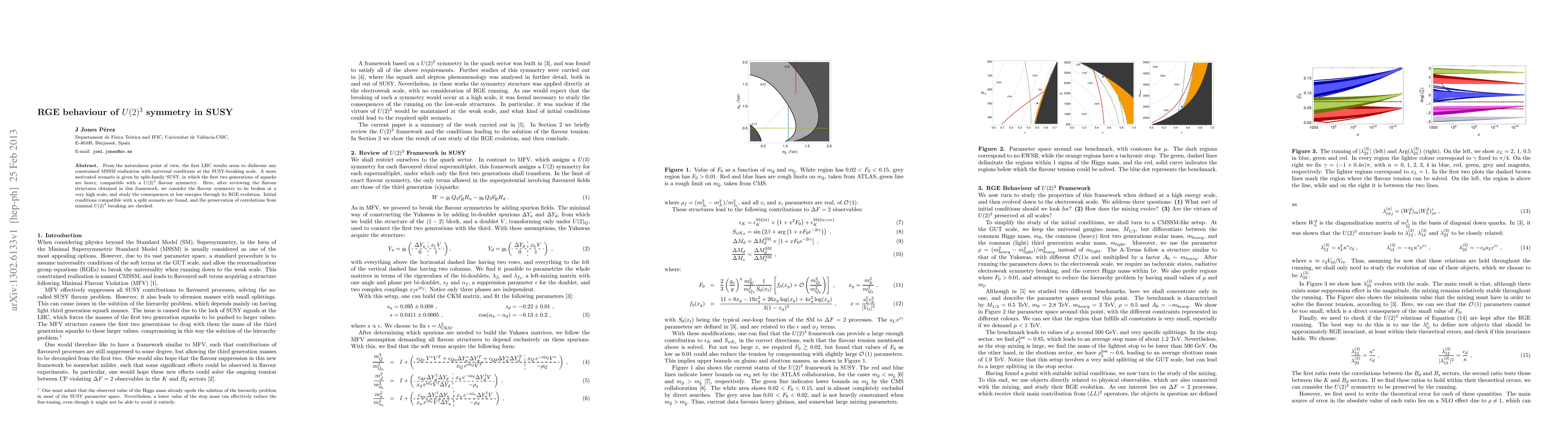 This paper explores the renormalization group evolution (RGE) of U(2)^3 symmetry in split-family SUSY, examining how high-scale flavour symmetry breaking impacts low-energy correlations, and finds initial conditions that preserve these correlations. The study suggests a more motivated scenario for the first LHC results.