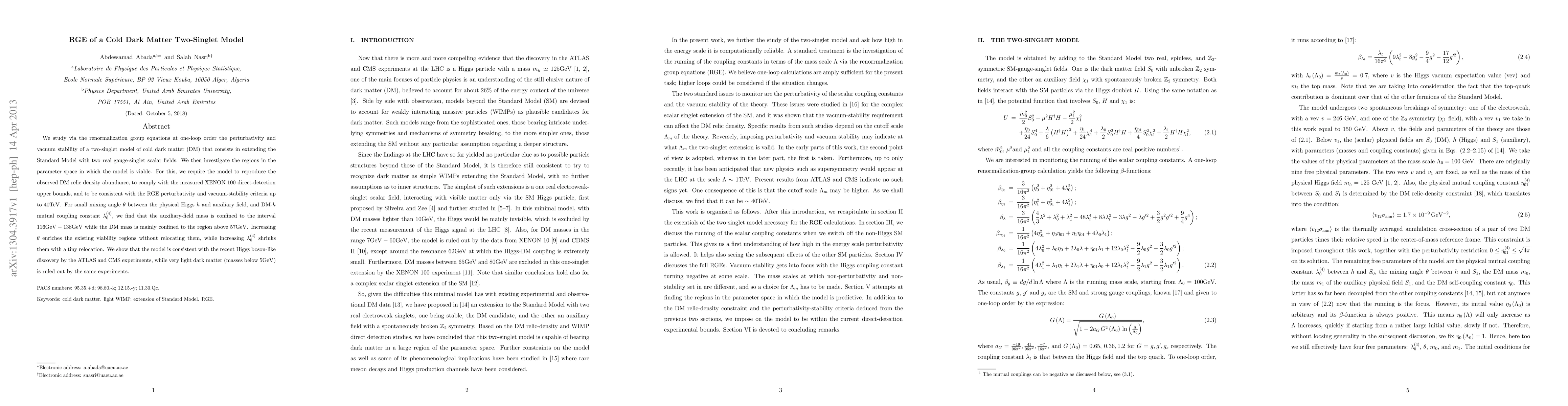 We study via the renormalization group equations at one-loop order the perturbativity and vacuum stability of a two-singlet model of cold dark matter (DM) that consists in extending the Standard Model with two real gauge-singlet scalar fields. We then investigate the regions in the parameter space in which the model is viable. For this, we require the model to reproduce the observed DM relic density abundance, to comply with the measured XENON 100 direct-detection upper bounds, and to be consistent with the RGE perturbativity and vacuum-stability criteria up to $40\mathrm{TeV}$. For small mixing angle $\theta $ between the physical Higgs $h$ and auxiliary field, and DM-$h$ mutual coupling constant $\lambda_{0}^{(4)}$, we find that the auxiliary-field mass is confined to the interval $116\mathrm{GeV}-138\mathrm{GeV}$ while the DM mass is mainly confined to the region above $57\mathrm{GeV}$. Increasing $\theta $ enriches the existing viability regions without relocating them, while increasing $\lambda_{0}^{(4)}$ shrinks them with a tiny relocation. We show that the model is consistent with the recent Higgs boson-like discovery by the ATLAS and CMS experiments, while very light dark matter (masses below $5\mathrm{GeV}$) is ruled out by the same experiments.