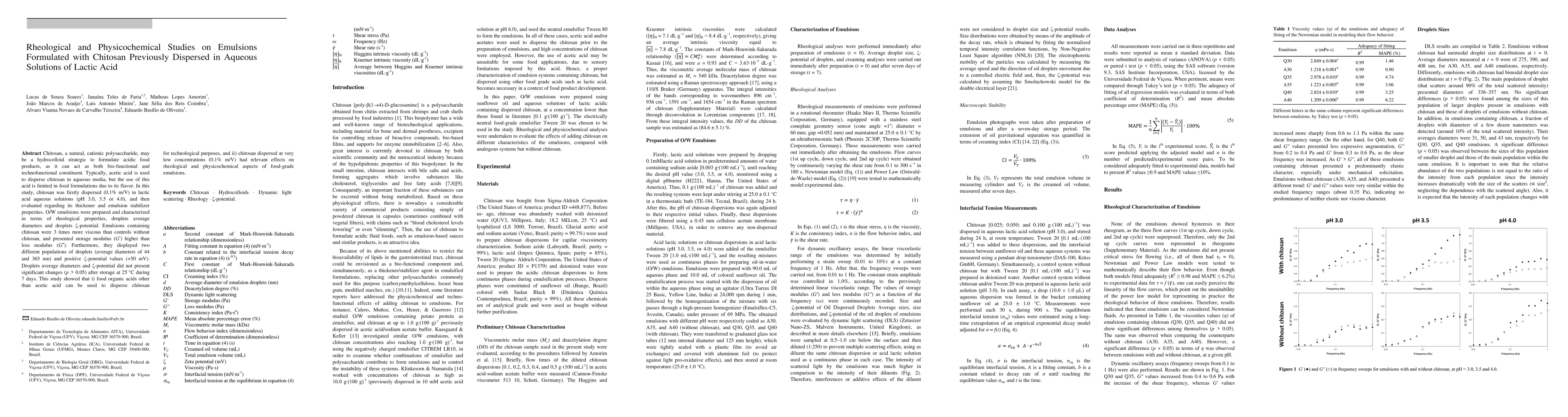 This study investigates the rheological and physicochemical properties of emulsions formulated with chitosan dispersed in lactic acid, demonstrating that chitosan enhances emulsion viscosity, stability, and structure, while maintaining droplet size and charge stability over 7 days.