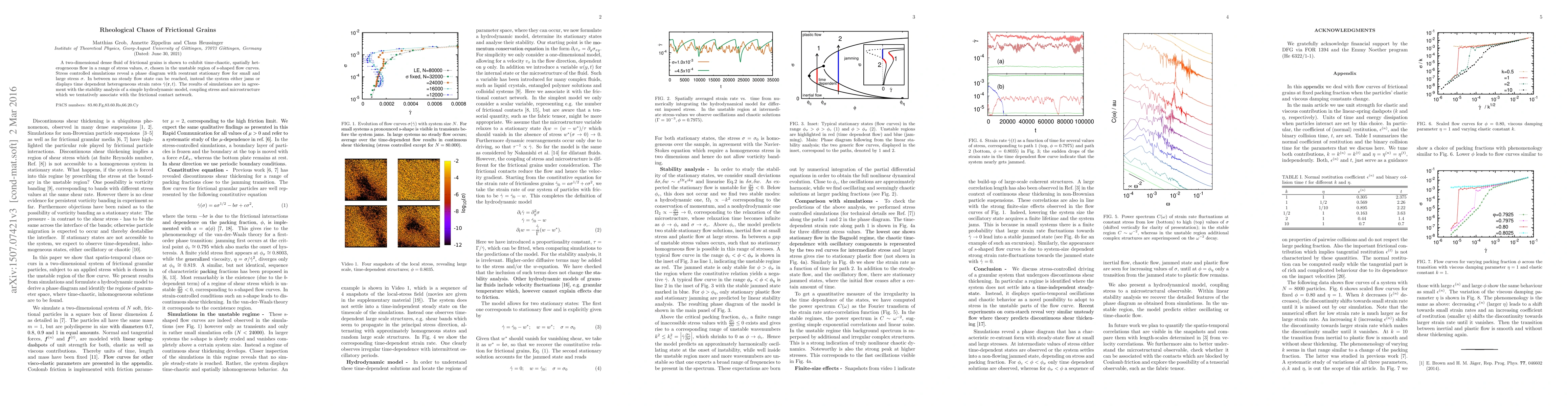 A two-dimensional dense fluid of frictional grains is shown to exhibit time-chaotic, spatially heterogeneous flow in a range of stress values, $\sigma$, chosen in the unstable region of s-shaped flow curves. Stress controlled simulations reveal a phase diagram with reentrant stationary flow for small and large stress $\sigma$. In between no steady flow state can be reached, instead the system either jams or displays time dependent heterogeneous strain rates $\dot\gamma({\bf r},t)$. The results of simulations are in agreement with the stability analysis of a simple hydrodynamic model, coupling stress and microstructure which we tentatively associate with the frictional contact network.