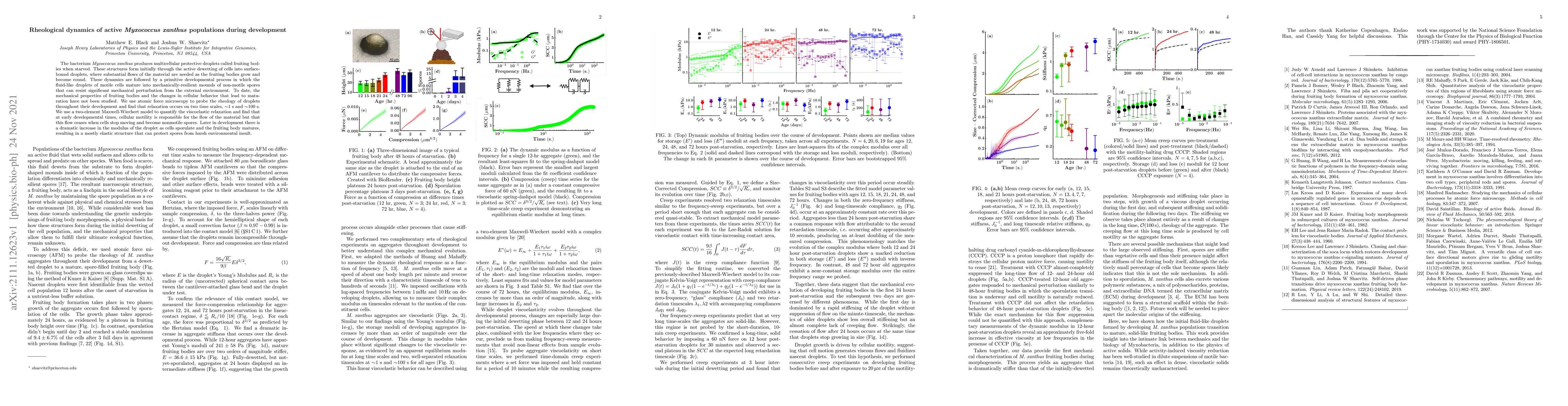 The bacterium Myxoccocus xanthus produces multicellular protective droplets called fruiting bodies when starved. These structures form initially through the active dewetting of cells into surface-bound droplets, where substantial flows of the material are needed as the fruiting bodies grow and become round. These dynamics are followed by a primitive developmental process in which the fluid-like droplets of motile cells mature into mechanically-resilient mounds of non-motile spores that can resist significant mechanical perturbation from the external environment. To date, the mechanical properties of fruiting bodies and the changes in cellular behavior that lead to maturation have not been studied. We use atomic force microscopy to probe the rheology of droplets throughout their development and find that relaxation occurs on two time scales, $\sim$1~s and $\sim$100~s. We use a two-element Maxwell-Wiechert model to quantify the viscoelastic relaxation and find that at early developmental times, cellular motility is responsible for the flow of the material but that this flow ceases when cells stop moving and become nonmotile spores. Later in development there is a dramatic increase in the modulus of the droplet as cells sporulate and the fruiting body matures, resulting in a mostly elastic structure that can protect spores from harsh environmental insult.
