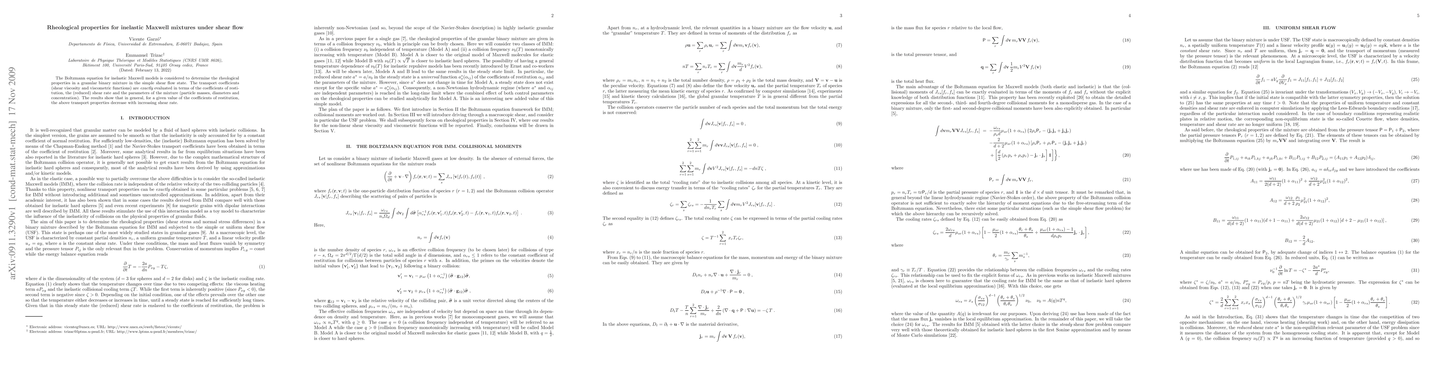This paper evaluates the rheological properties of inelastic Maxwell mixtures under shear flow using the Boltzmann equation, finding that transport coefficients like shear viscosity decrease with increasing shear rate for a given restitution coefficient.