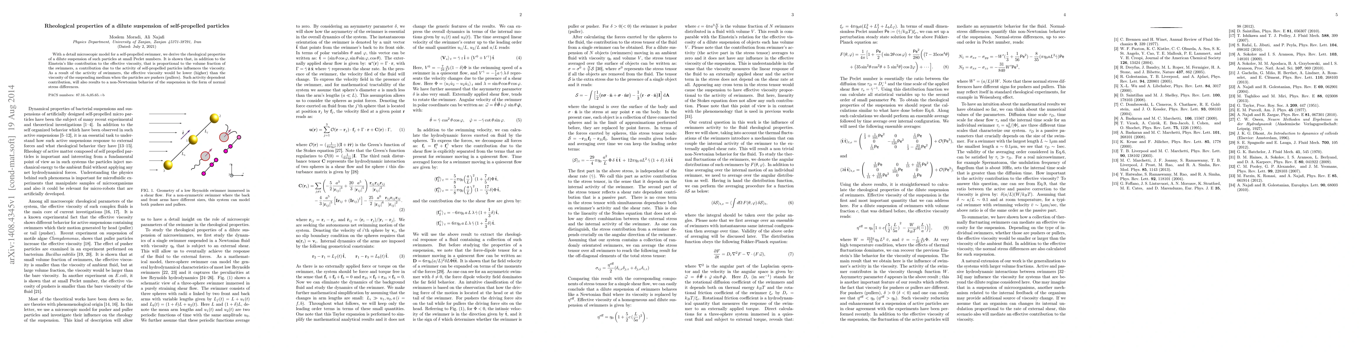 With a detail microscopic model for a self-propelled swimmer, we derive the rheological properties of a dilute suspension of such particles at small Peclet numbers. It is shown that, in addition to the Einstein's like contribution to the effective viscosity, that is proportional to the volume fraction of the swimmers, a contribution due to the activity of self-propelled particles influences the viscosity. As a result of the activity of swimmers, the effective viscosity would be a lower (higher) than the viscosity of the suspending medium when the particles are pushers (pullers). Such activity dependent contribution, will also results to a non-Newtonian behavior of the suspension in the form of normal stress differences.