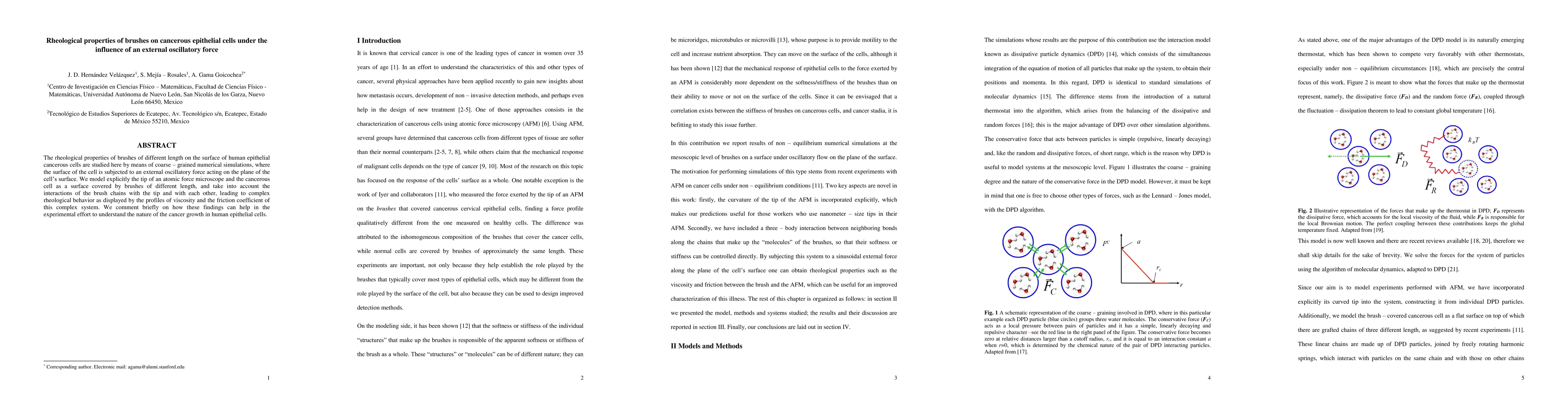 The rheological properties of brushes of different length on the surface of human epithelial cancerous cells are studied here by means of coarse grained numerical simulations, where the surface of the cell is subjected to an external oscillatory force acting on the plane of the cell surface. We model explicitly the tip of an atomic force microscope and the cancerous cell as a surface covered by brushes of different length, and take into account the interactions of the brush chains with the tip and with each other, leading to complex rheological behavior as displayed by the profiles of viscosity and the friction coefficient of this complex system. We comment briefly on how these findings can help in the experimental effort to understand the nature of the cancer growth in human epithelial cells.