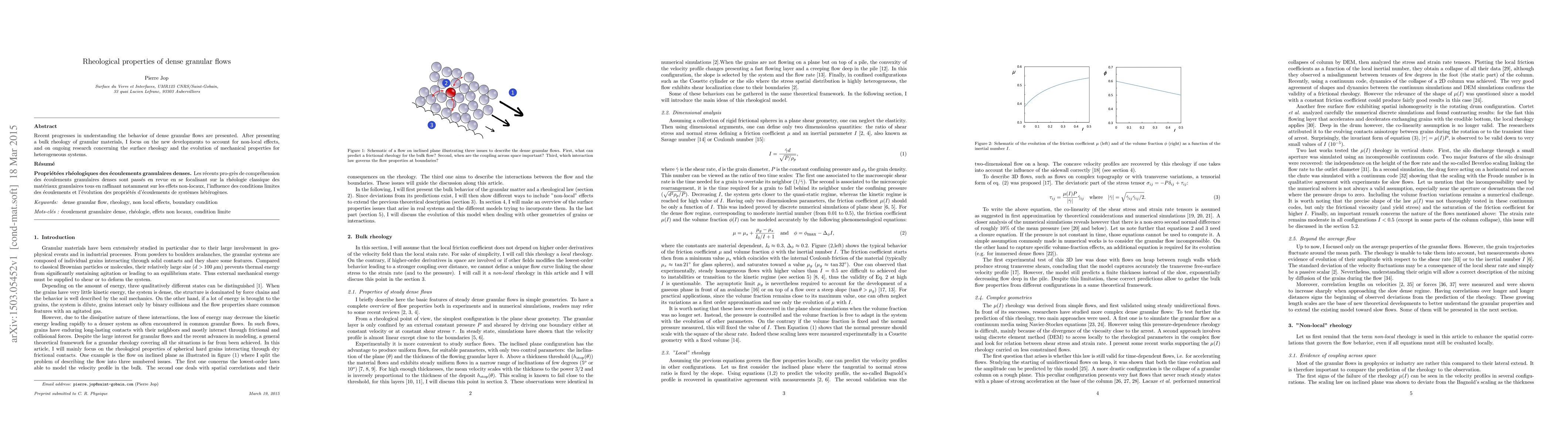 This paper reviews advancements in understanding the rheological behavior of dense granular flows, emphasizing new methods to account for non-local effects and ongoing studies on surface rheology and mechanical properties in heterogeneous systems.