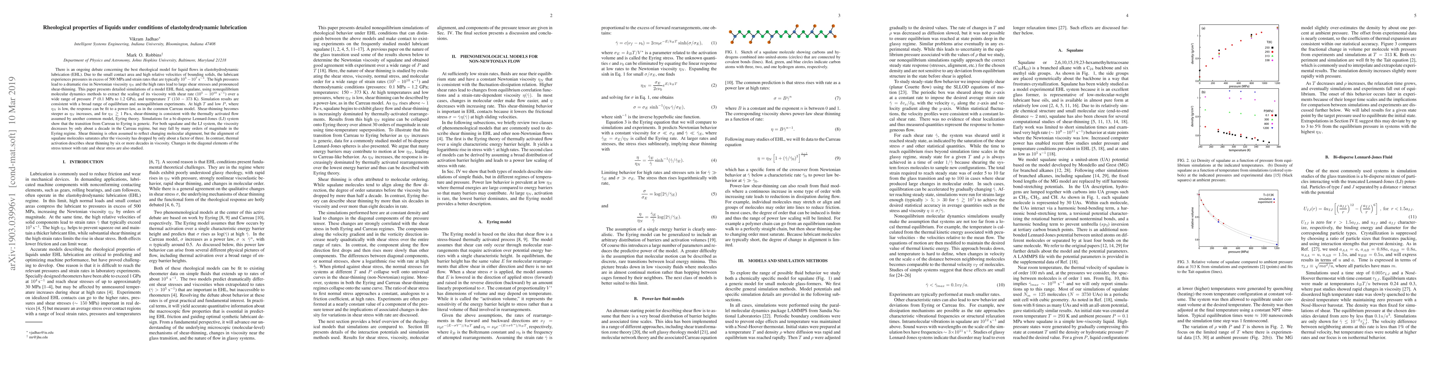 There is an ongoing debate concerning the best rheological model for liquid flows in elastohydrodynamic lubrication (EHL). Due to the small contact area and high relative velocities of bounding solids, the lubricant experiences pressures in excess of 500 MPa and strain rates that are typically $10^5 -10^7$ $\textrm{s}^{-1}$. The high pressures lead to a dramatic rise in Newtonian viscosity $\eta_{N}$ and the high rates lead to large shear stresses and pronounced shear-thinning. This paper presents detailed simulations of a model EHL fluid, squalane, using nonequilibrium molecular dynamics methods to extract the scaling of its viscosity with shear rate ($10^5 - 10^{10}$ $\textrm{s}^{-1}$) over a wide range of pressure $P$ (0.1 MPa to 1.2 GPa), and temperature $T$ ($150 - 373$ K). Simulation results are consistent with a broad range of equilibrium and nonequilibrium experiments. At high $T$ and low $P$, where $\eta_{N}$ is low, the response can be fit to a power-law, as in the common Carreau model. Shear-thinning becomes steeper as $\eta_{N}$ increases, and for $\eta_{N}\gtrsim 1$ Pa-s, shear-thinning is consistent with the thermally activated flow assumed by another common model, Eyring theory. Simulations for a bi-disperse Lennard-Jones (LJ) system show that the transition from Carreau to Eyring is generic. For both squalane and the LJ system, the viscosity decreases by only about a decade in the Carreau regime, but may fall by many orders of magnitude in the Eyring regime. Shear thinning is often assumed to reflect changing molecular alignment, but the alignment of squalane molecules saturates after the viscosity has dropped by only about a factor of three. In contrast, thermal activation describes shear thinning by six or more decades in viscosity. Changes in the diagonal elements of the stress tensor with rate and shear stress are also studied.