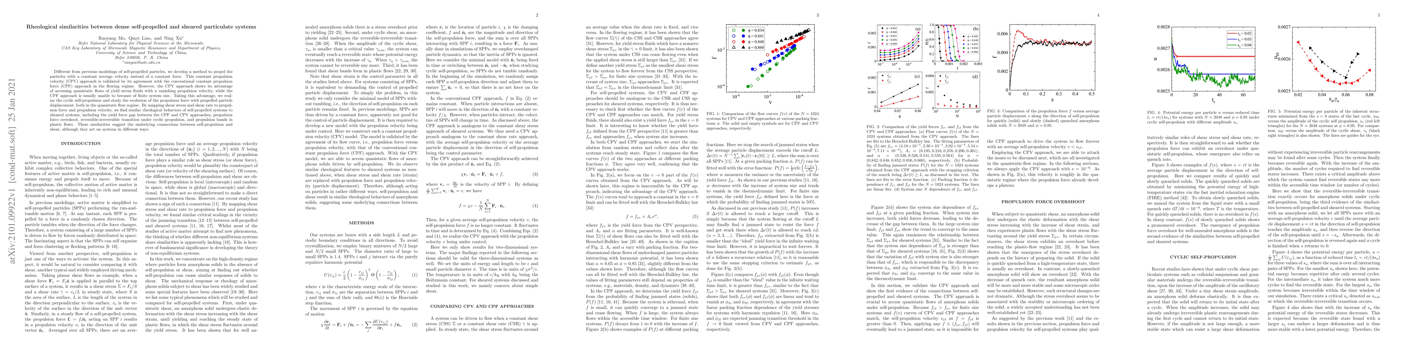 This paper develops a constant propulsion velocity (CPV) approach for modeling self-propelled particles, demonstrating its advantages over the conventional constant propulsion force (CPF) in accessing quasistatic flows. It finds similar rheological behaviors between self-propelled and sheared particulate systems, suggesting underlying connections between self-propulsion and shear.