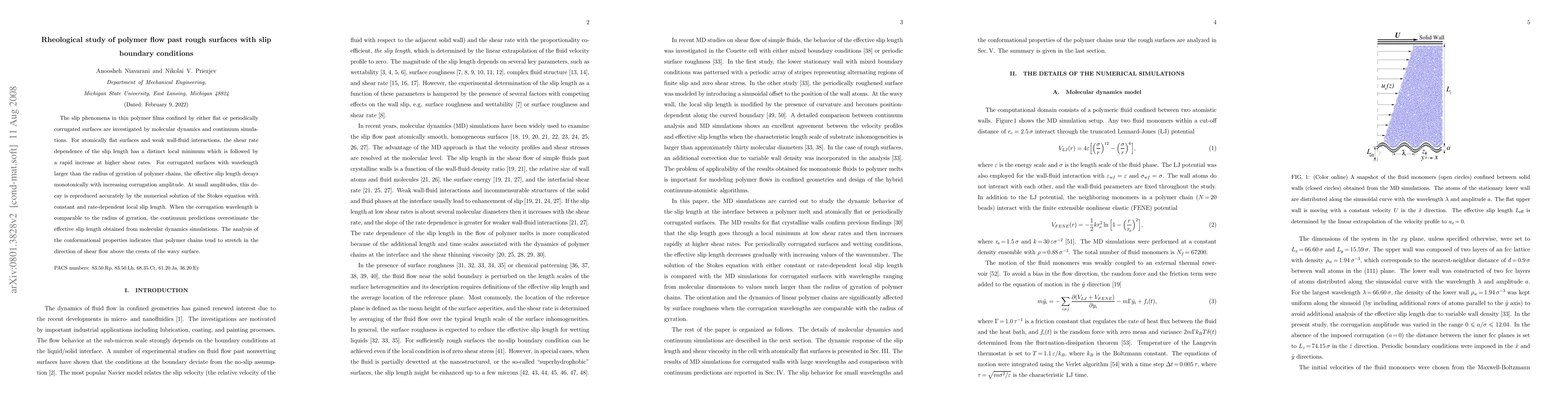 This study investigates polymer flow past rough surfaces using molecular dynamics and continuum simulations, revealing that slip length behavior varies with surface roughness and shear rate. Polymer chains stretch above surface crests, affecting slip length, with continuum models overestimating slip in certain conditions.