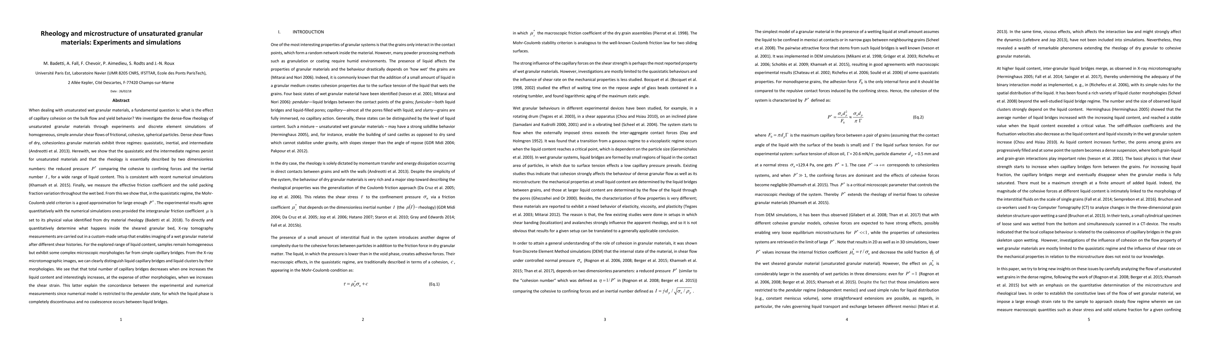 Summary: This paper investigates the dense flow rheology of unsaturated granular materials under capillary cohesion through experiments and discrete element simulations, focusing on the impact of capillary forces on the bulk flow and yield behavior of cohesive, spherical particles in simple annular shear flows.