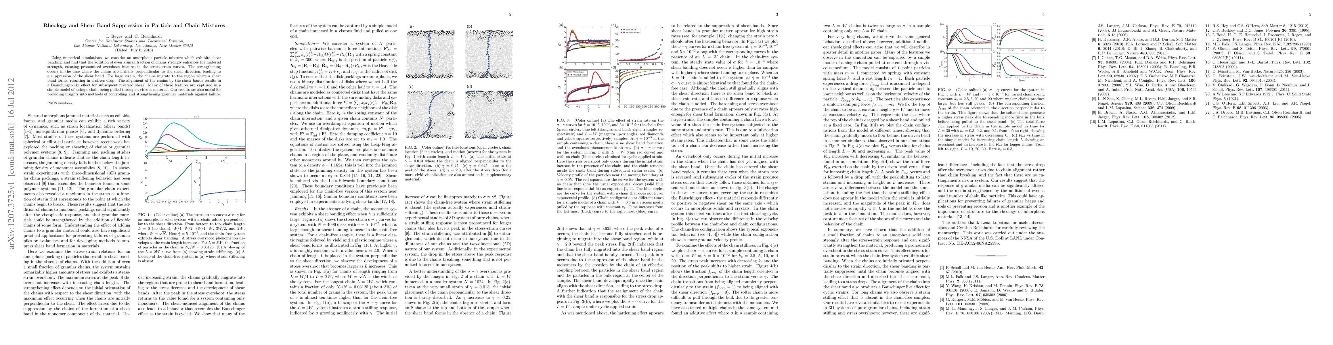 This paper uses numerical simulations to show that adding a small fraction of chains to an amorphous particle mixture suppresses shear banding and enhances material strength, leading to stress-strain overshoots. Chains initially perpendicular to shear direction migrate to shear bands under large strain, causing stress drops and a Bauschinger-like effect during reversed shear.