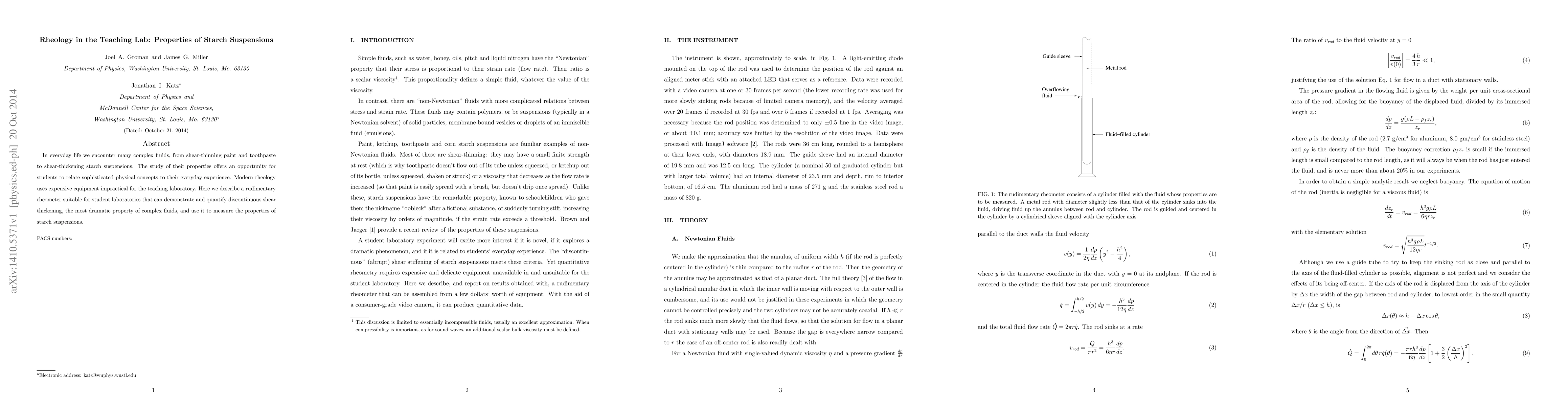 In everyday life we encounter many complex fluids, from shear-thinning paint and toothpaste to shear-thickening starch suspensions. The study of their properties offers an opportunity for students to relate sophisticated physical concepts to their everyday experience. Modern rheology uses expensive equipment impractical for the teaching laboratory. Here we describe a rudimentary rheometer suitable for student laboratories that can demonstrate and quantify discontinuous shear thickening, the most dramatic property of complex fluids, and use it to measure the properties of starch suspensions.