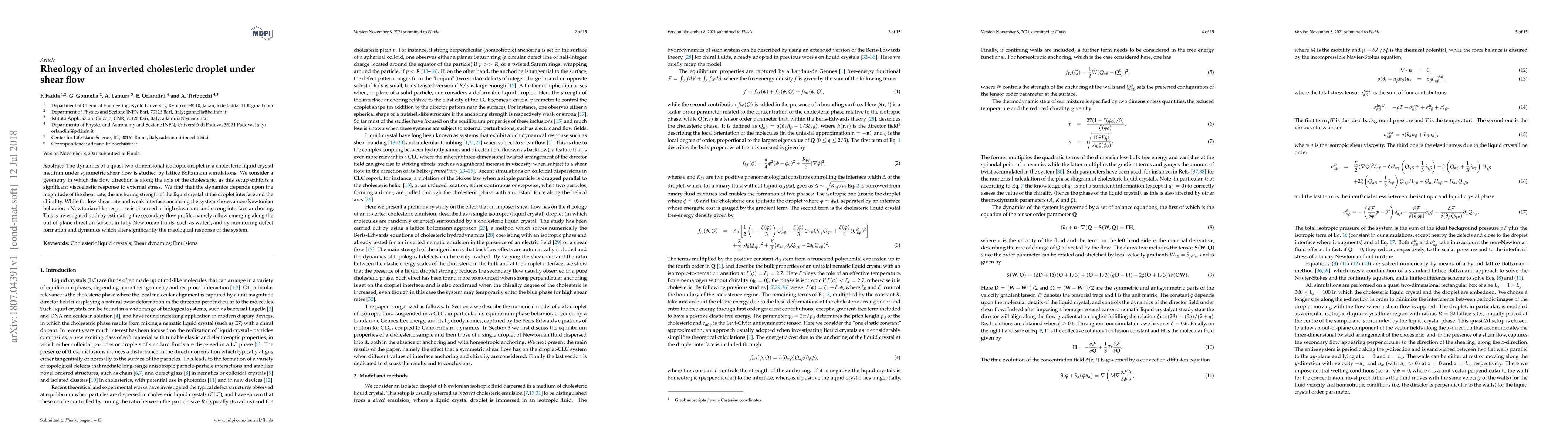 The dynamics of a quasi two-dimensional isotropic droplet in a cholesteric liquid crystal medium under symmetric shear flow is studied by lattice Boltzmann simulations. We consider a geometry in which the flow direction is along the axis of the cholesteric, as this setup exhibits a significant viscoelastic response to external stress. We find that the dynamics depends upon the magnitude of the shear rate, the anchoring strength of the liquid crystal at the droplet interface and the chirality. While for low shear rate and weak interface anchoring the system shows a non-Newtonian behavior, a Newtonian-like response is observed at high shear rate and strong interface anchoring. This is investigated both by estimating the secondary flow profile, namely a flow emerging along the out-of-plane direction (absent in fully Newtonian fluids, such as water), and by monitoring defect formation and dynamics which alter significantly the rheological response of the system.