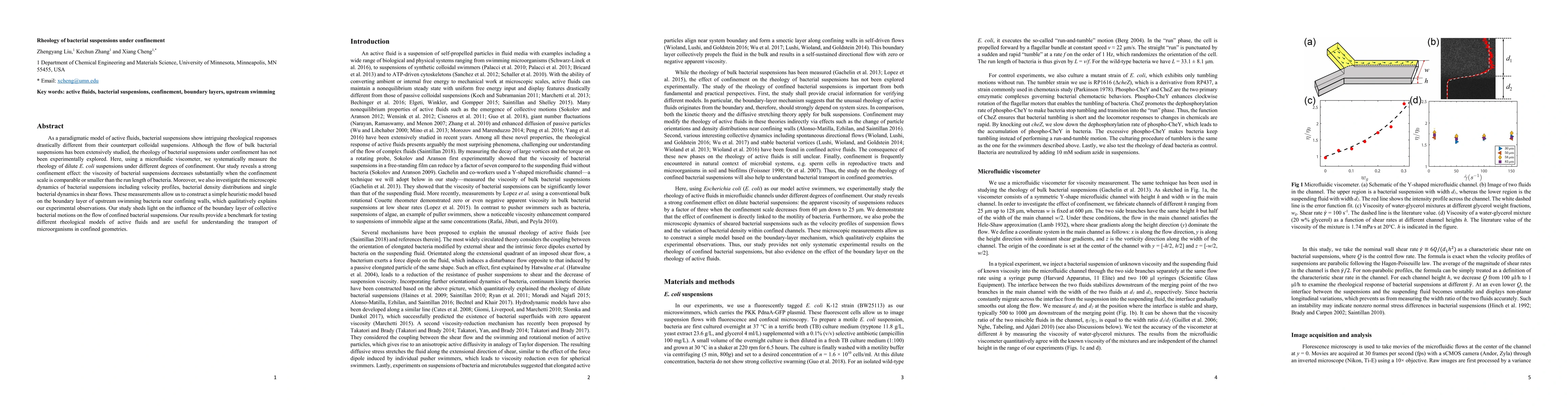 This study investigates the rheology of bacterial suspensions under confinement using microfluidic viscometers, revealing a significant decrease in viscosity when confinement scales are comparable to bacterial run lengths. The research also develops a heuristic model based on bacterial boundary layer dynamics to explain these observations.